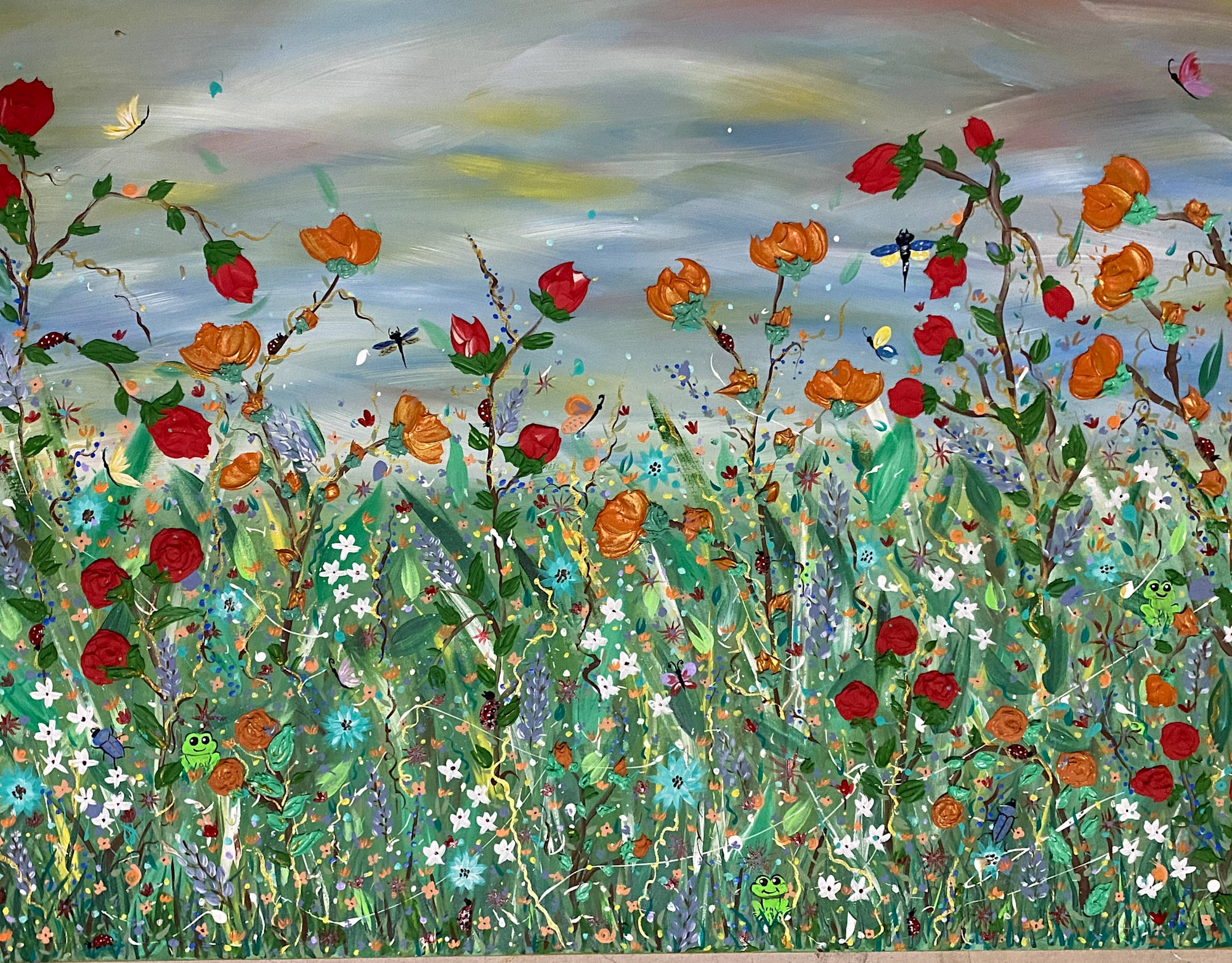 The sky is somewhat ominous in this field of flowers. The backdrop for poppies is appropriate as they represent remembrance. Many nations recognize this flower in shades of red and orange to remind them of the past. Most notably is war. I felt that putting this down on canvas lifted my spirits on Memorial Day as I was contemplating my family who gave all. I am not one to paint war or political scenes so I paint my feelings and observations through the heaviness of the atmosphere with the bold color of the flower.