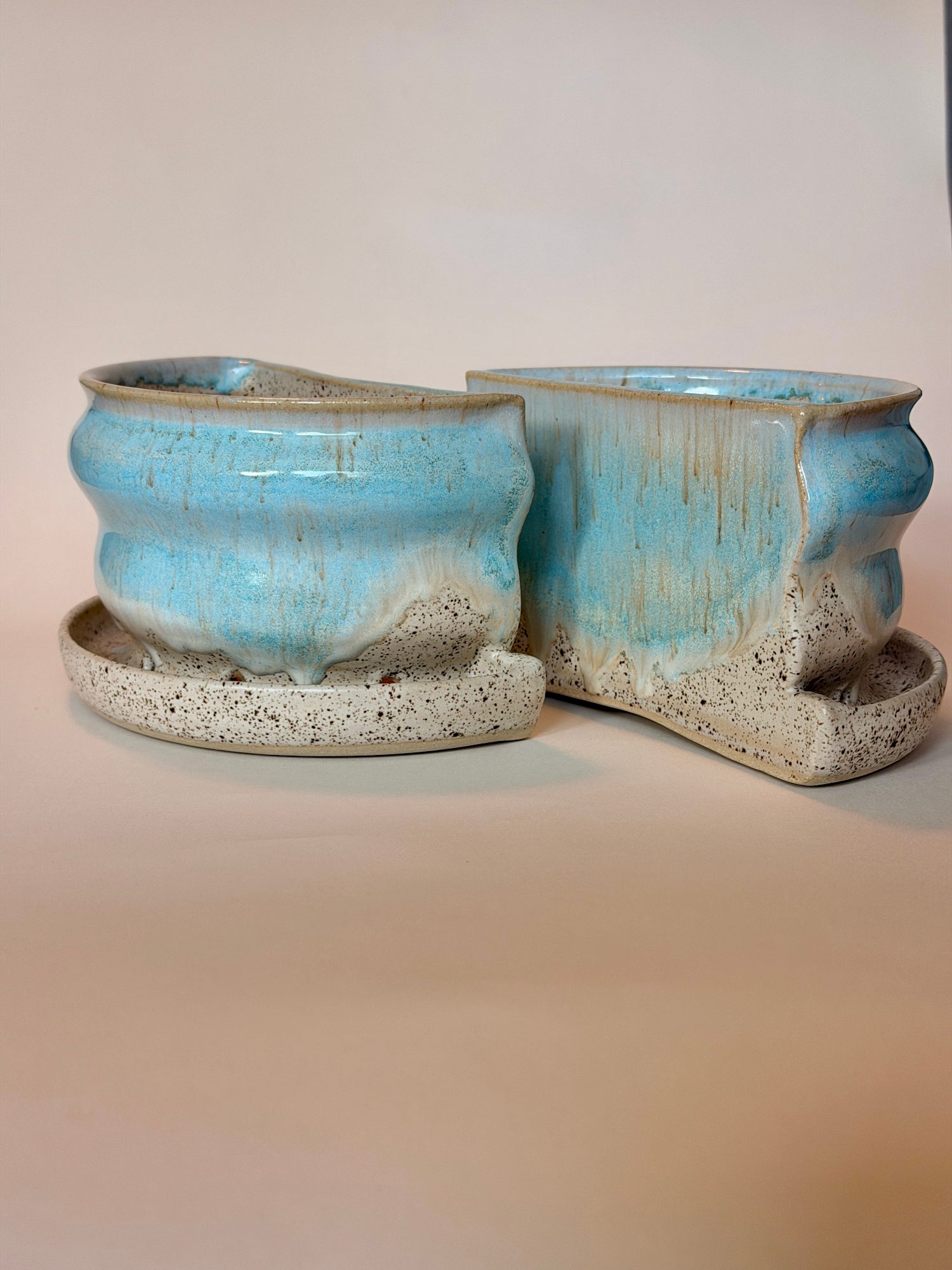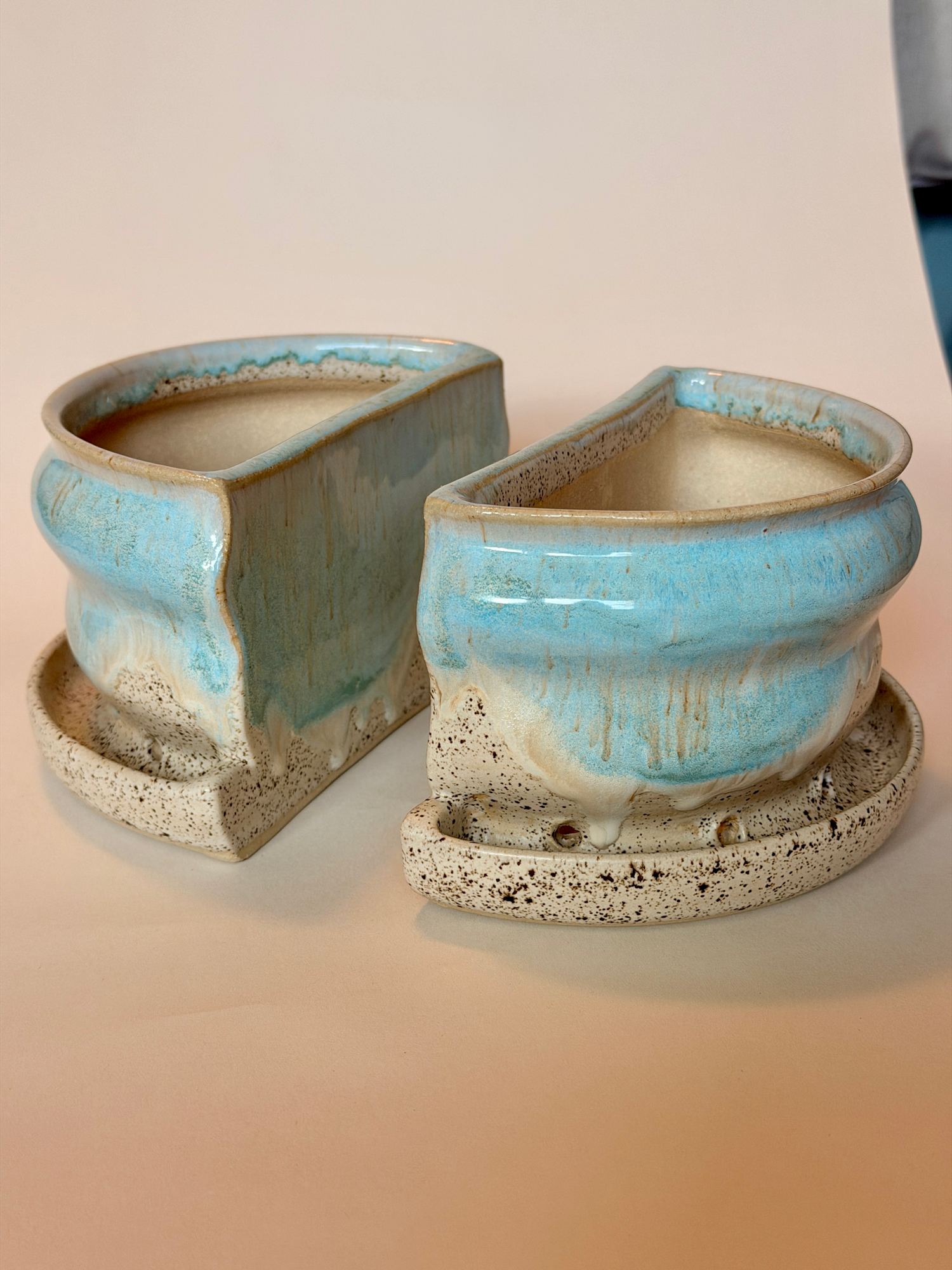 Dual function pieces designed as book end holders that will also hold fresh plants. With drains integrated in the design, they can sit directly on your shelf without you having to worry about a drain trivet for watering.