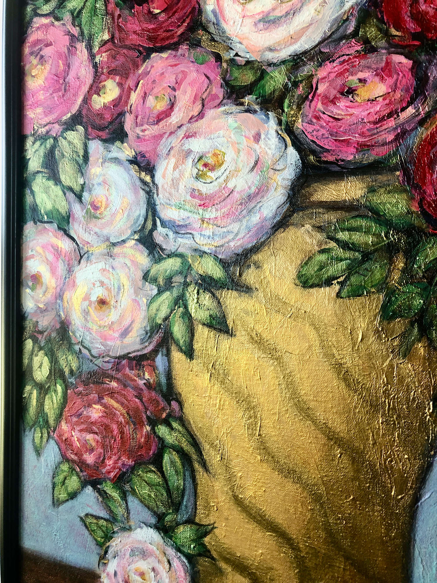A free-form gold-kissed Rose Bouquet of different variety and color in a golden vase.