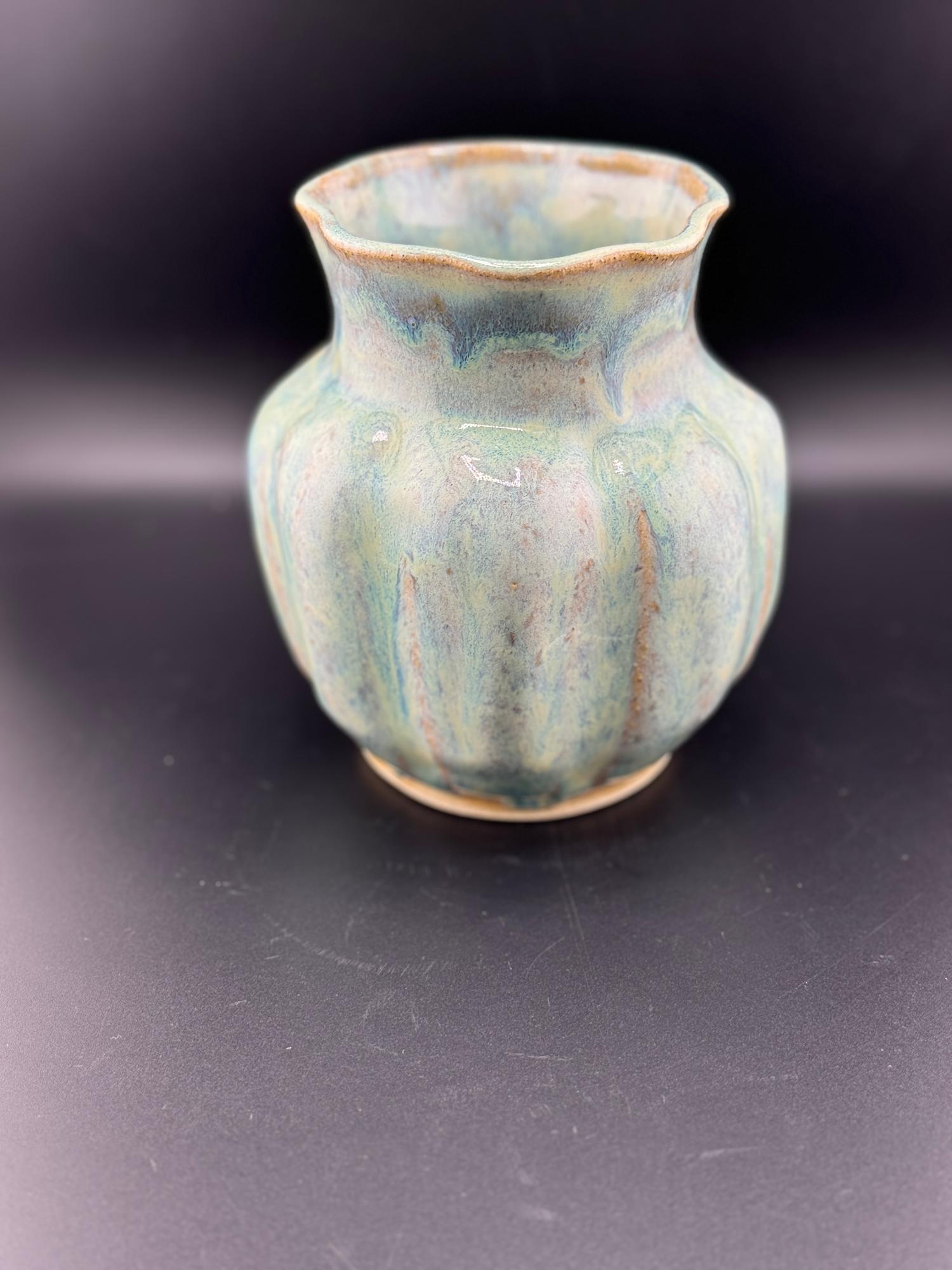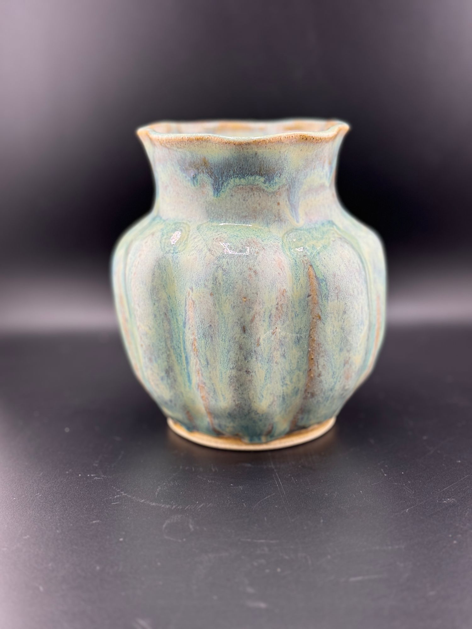 Wheelthrown vase was then sculpted and manipulated to form a unique shape. Glazes were brushed by hand to achieve various tones of green and blue.