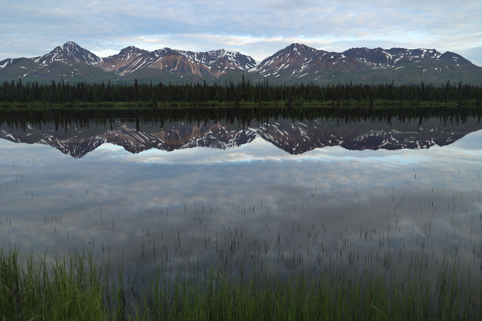 Mountain reflection on lake, 11pm, Denali National Park, Alaska