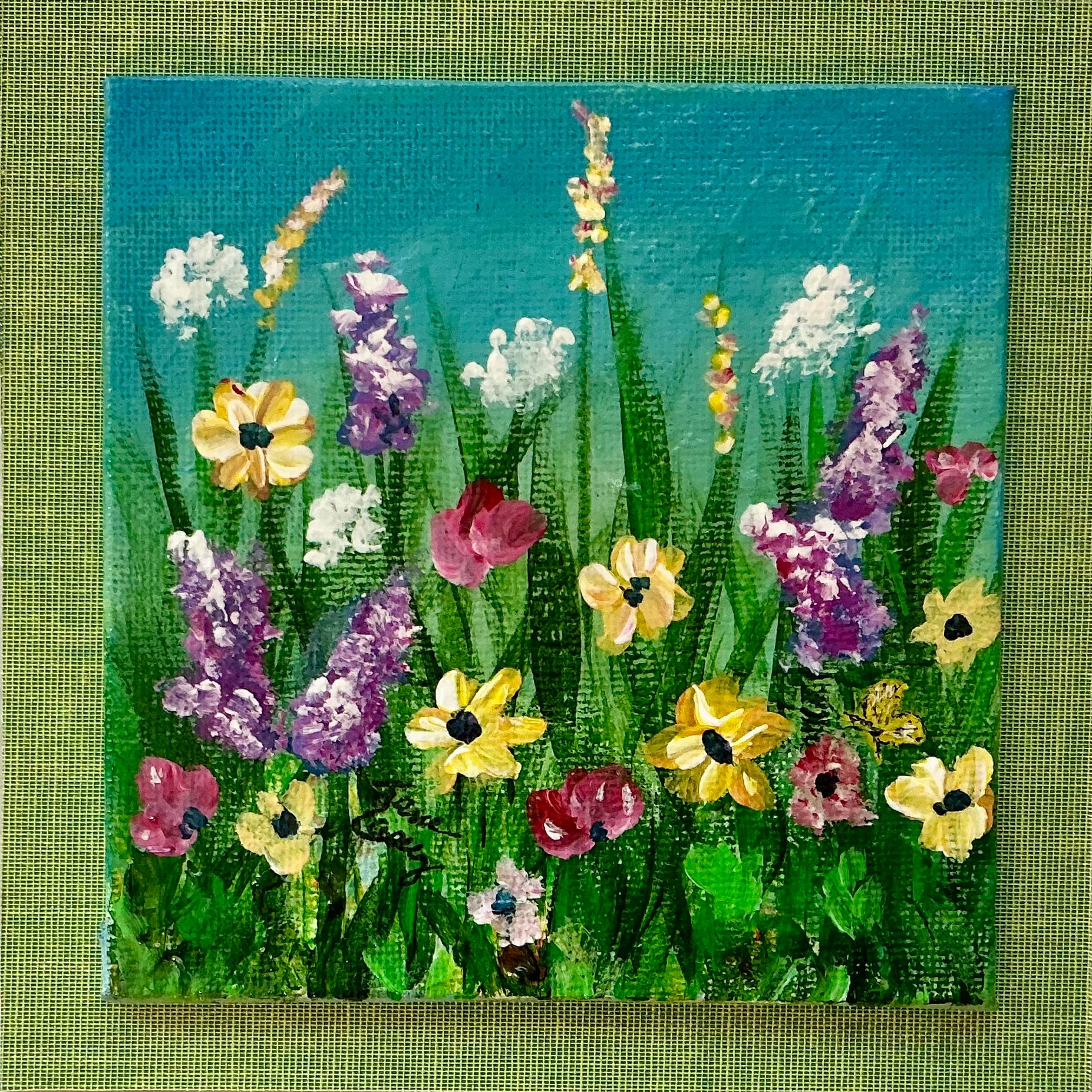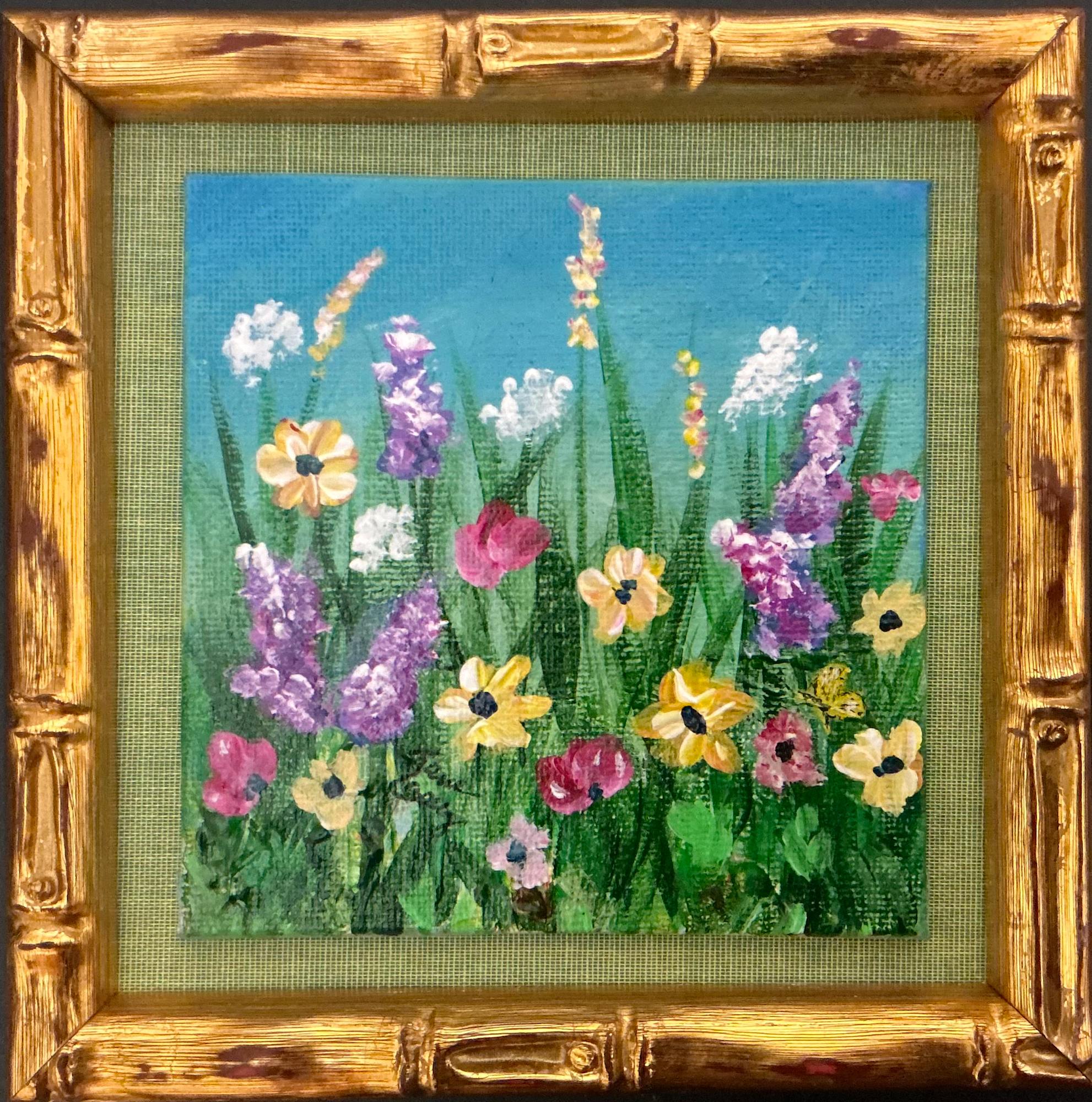 These bright whimsical wildflowers will brighten your mood and your day, painted on a 4 x 4 canvas panel. The canvas panel is mounted on a beautiful custom mat, frame to enhance the painting’s beauty.
