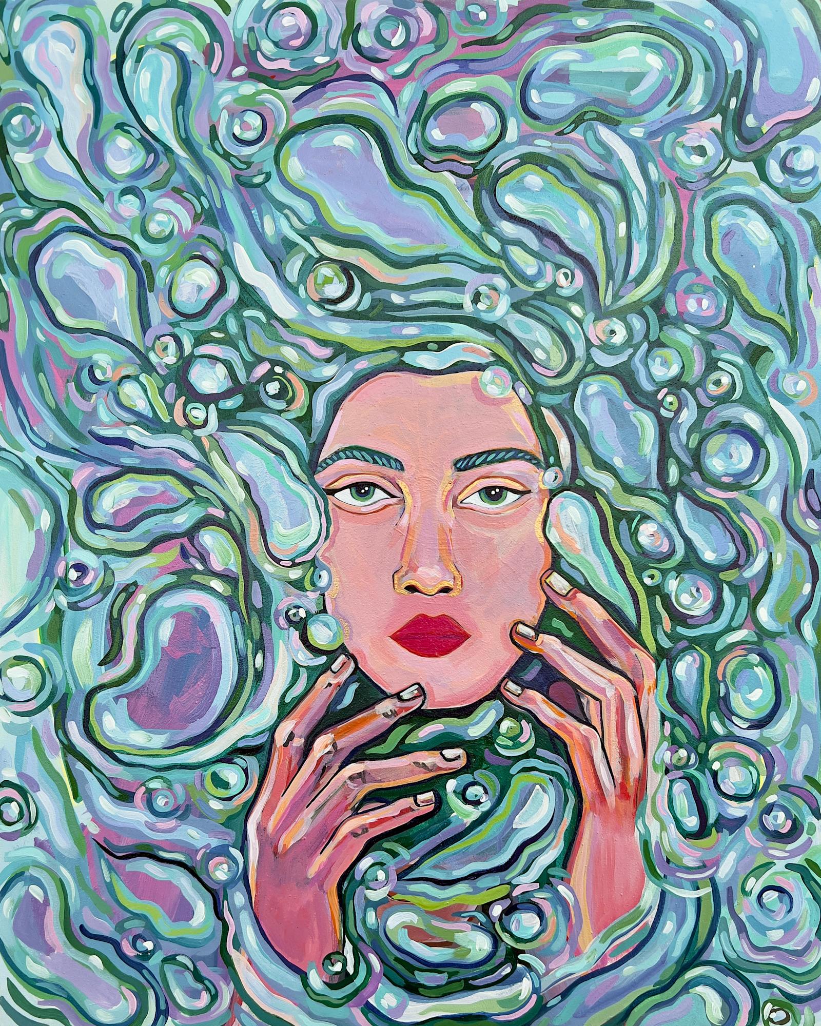Woman, face and hands out of water, blue eyebrows, red lips.
