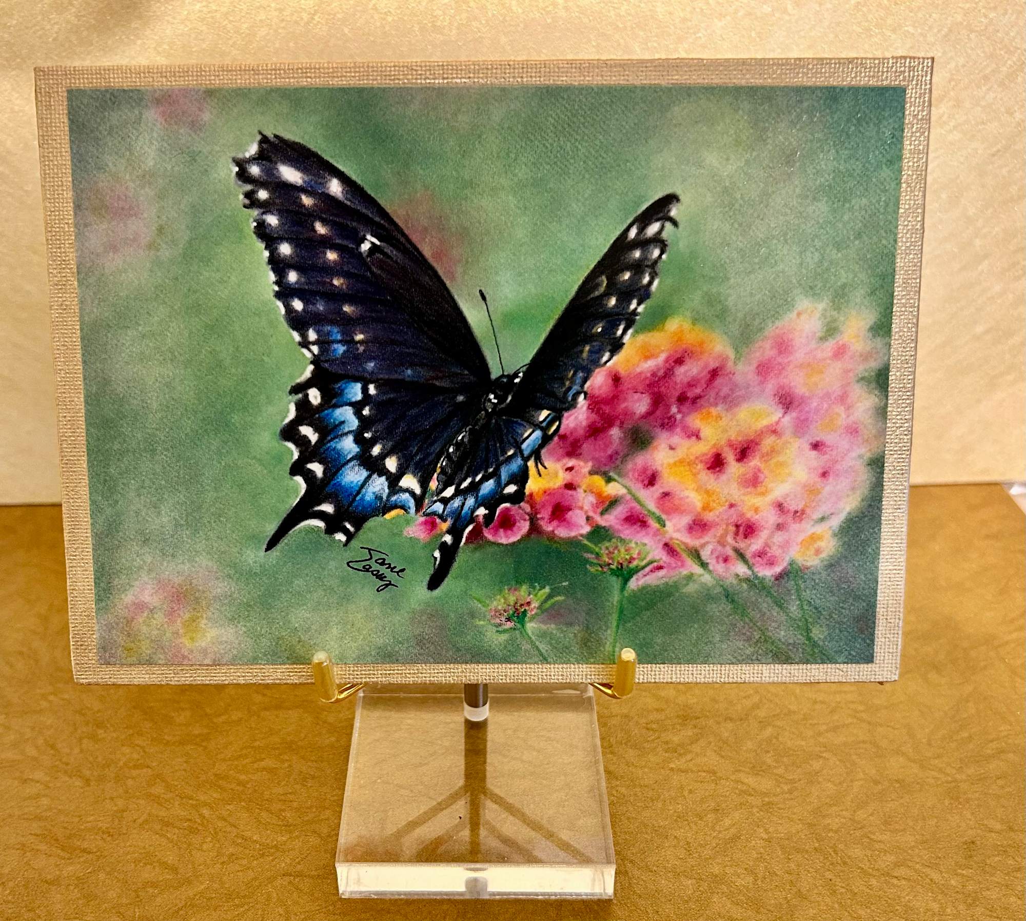 Beautiful Black swallowtail painted on 300 lb hot pressed watercolor paper mounted on a gold canvas board. Comes with an acrylic and gold easel for display.