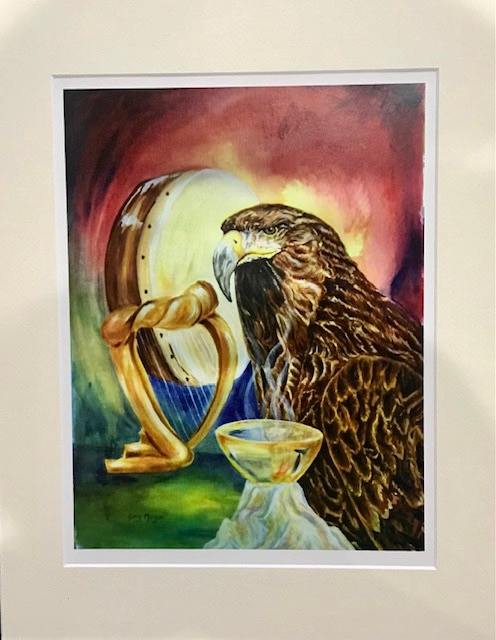 The original painting is hanging in a Church in Belfast, Northern Ireland. It was painted during a worship service. The bodhran, drum, and the harp are symbols of the Irish culture. The golden eagle is also a symbol of Northern Ireland. The small bowl at the base of the painting represents the prayers of the people. The smoke arising refers to the sweet smell of our prayers that ascends to the nostrils of God.
