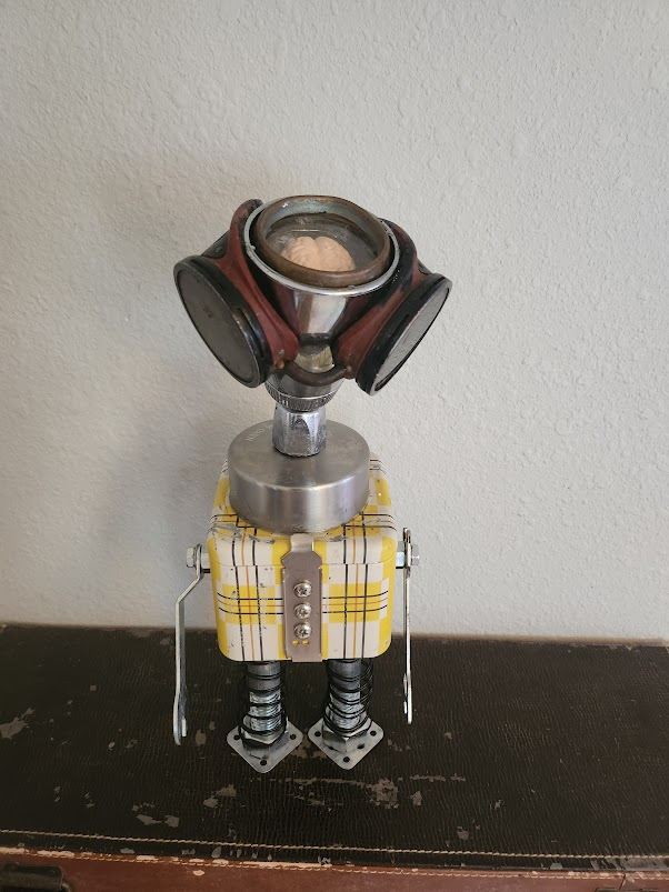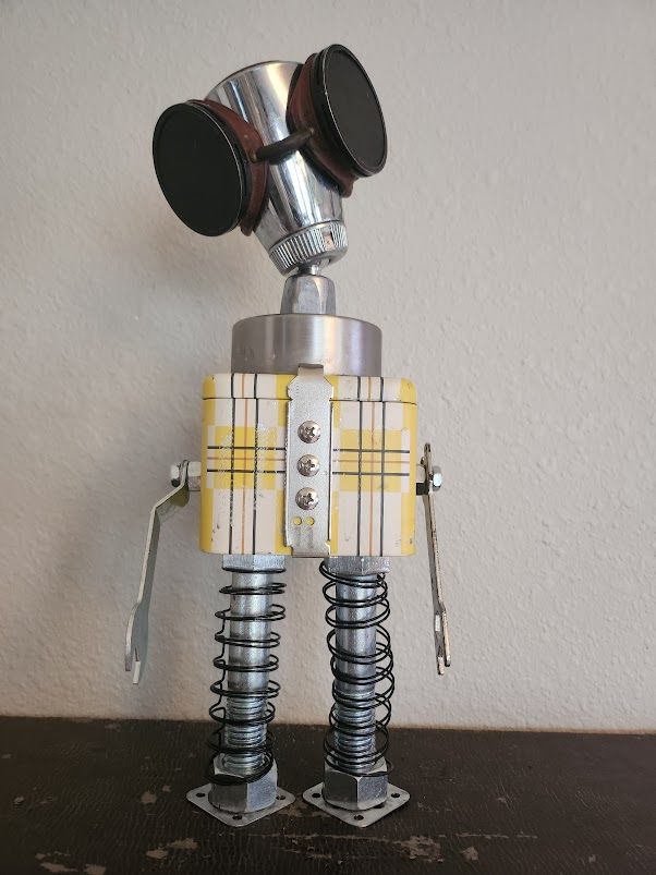The artwork depicts a small robot sculpture made from various repurposed materials. The robot's head is constructed from a shower head and flashlight cover enclosing a brain, with welding goggles serving as eyes. Its torso is a yellow and white plaid-patterned rectangular tin, with a vertical strip featuring three metallic buttons in the center. The arms are wrenches attached to the sides, and the legs consist of coiled springs mounted on square metal bases that serve as feet. The overall aesthetic blends industrial and retro elements, giving the robot a whimsical, handcrafted charm.