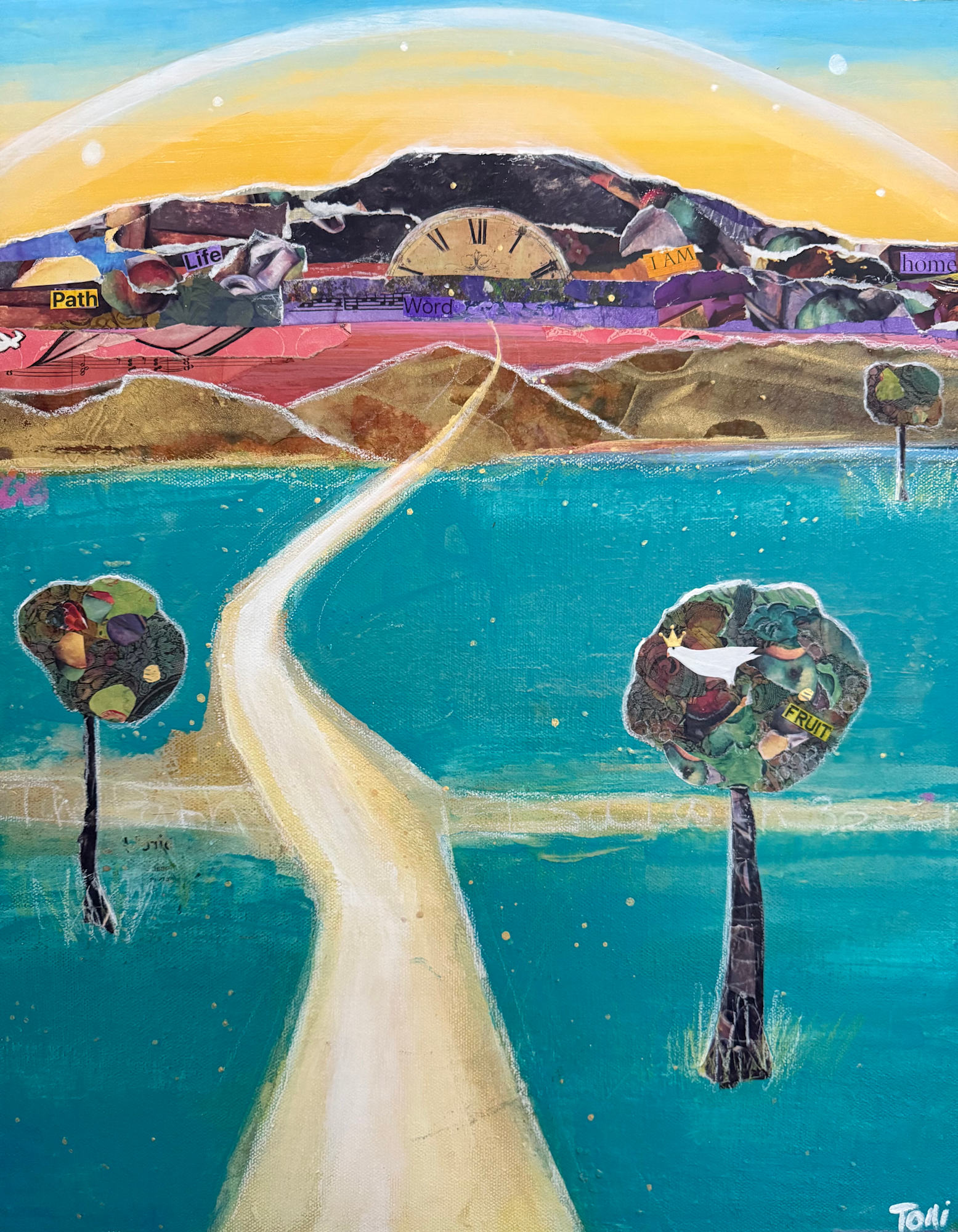 In this painting, the mountain represents our heavenly home. The pathway is our journey in life once we’ve come to know Christ as our Lord and Saviour. His word is the light that guides us along the way so we always know whether to turn left or right. As we grow in him we recognize his instructions, follow them and the fruit of the Spirit grows in our lives. We become a light for others and God uses us to help them find their way home too.