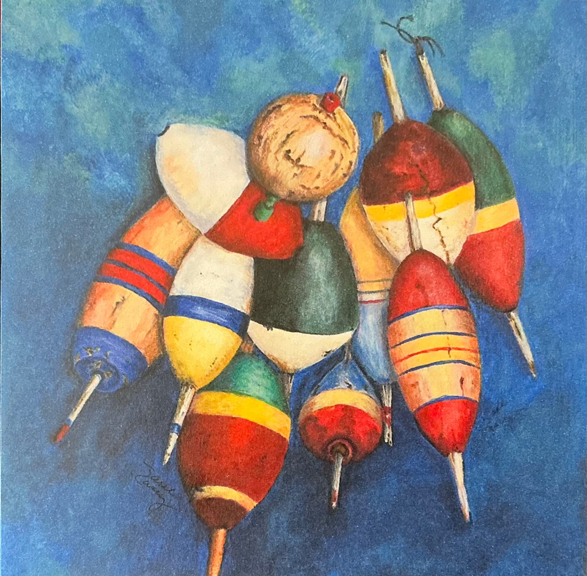 A print of my original acrylic painting of antique fishing bobbers. The print is mounted on a canvas panel and framed in a beautiful rustic, natural wood floater frame.