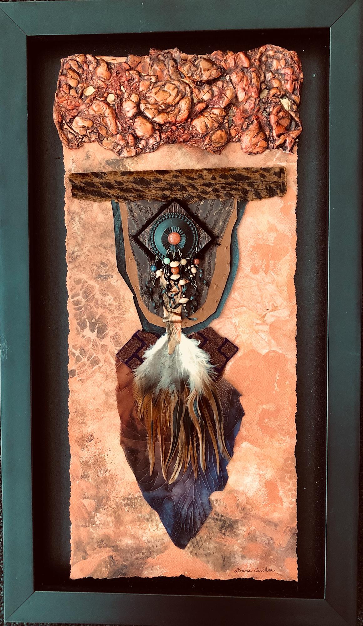 Black frame with inset 3-D handmade papers,, beads, feathers, fabrics and textures.