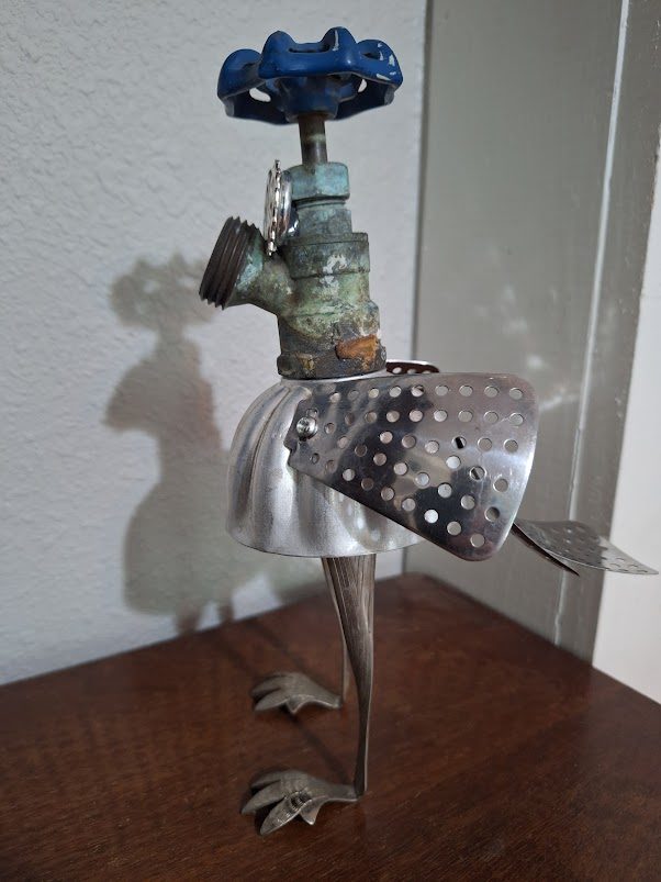 This artwork is a whimsical sculpture crafted from metal and mechanical parts, designed to resemble a bird. The bird's body is formed by a metal jello mold, giving it a smooth, polished look similar to a dress or a shell. Its wings are made of pieces from a steamer basket, extending from the body to evoke feathers. The head consists of a blue valve handle on top, serving as a crest, with two metal gears positioned like eyes. The neck is a cylindrical metal pipe, and the beak is represented by a hollow, circular opening. The sculpture stands on two slender metal legs ending in clawed feet, giving it a sturdy, grounded appearance. The overall composition merges industrial materials with a playful avian form, showcasing creativity through repurposing everyday objects.