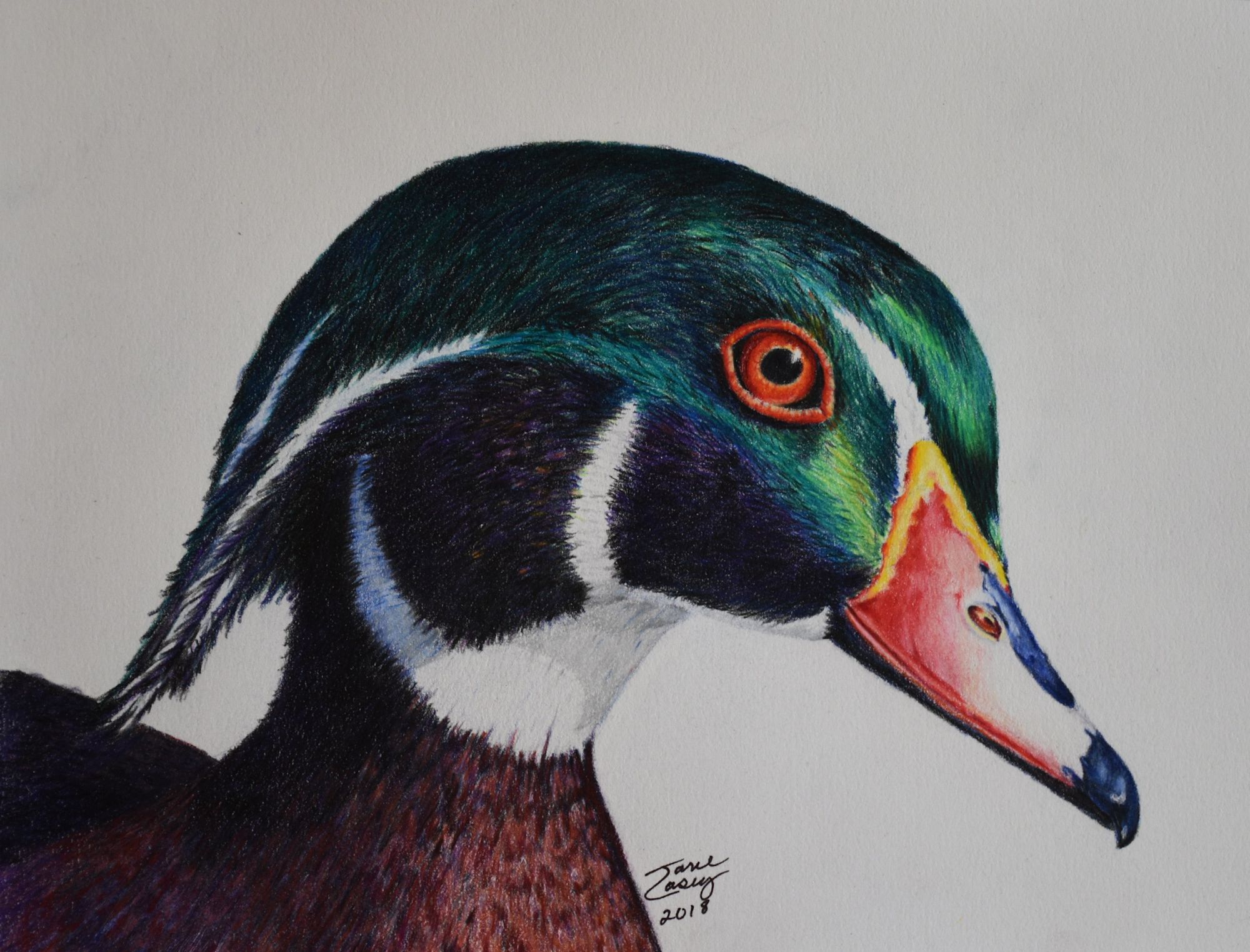 Print of a Colorful Male Wood Duck head and breast, framed and matted.