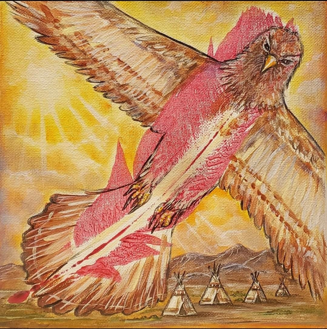 Inspired from the actual feather of a Red-tailed Hawk this piece depicts the creature flying over a peaceful Native American Village.