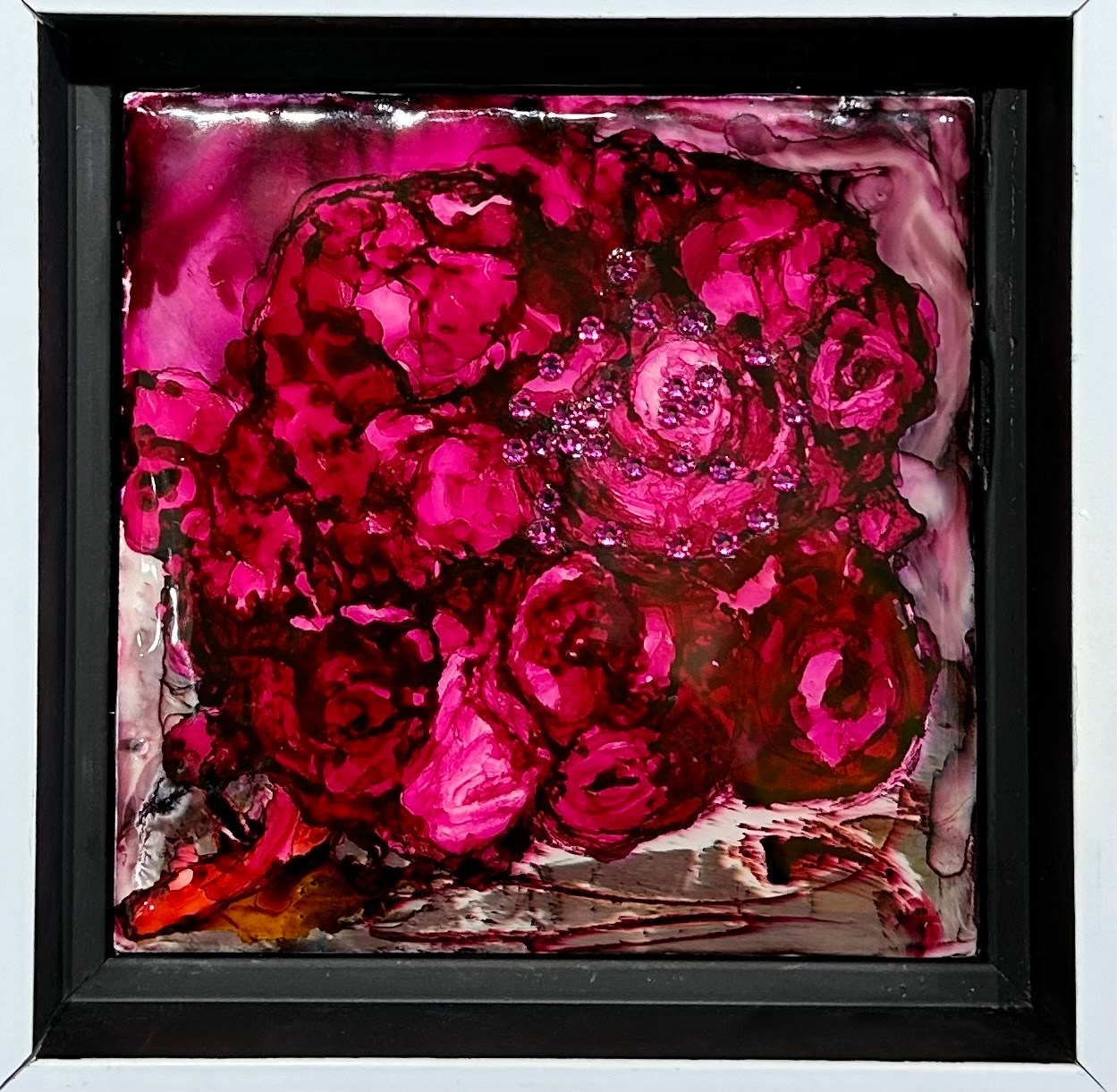 Red and pink roses in alcohol Ink on ceramic tile with rose toned rhinestones.