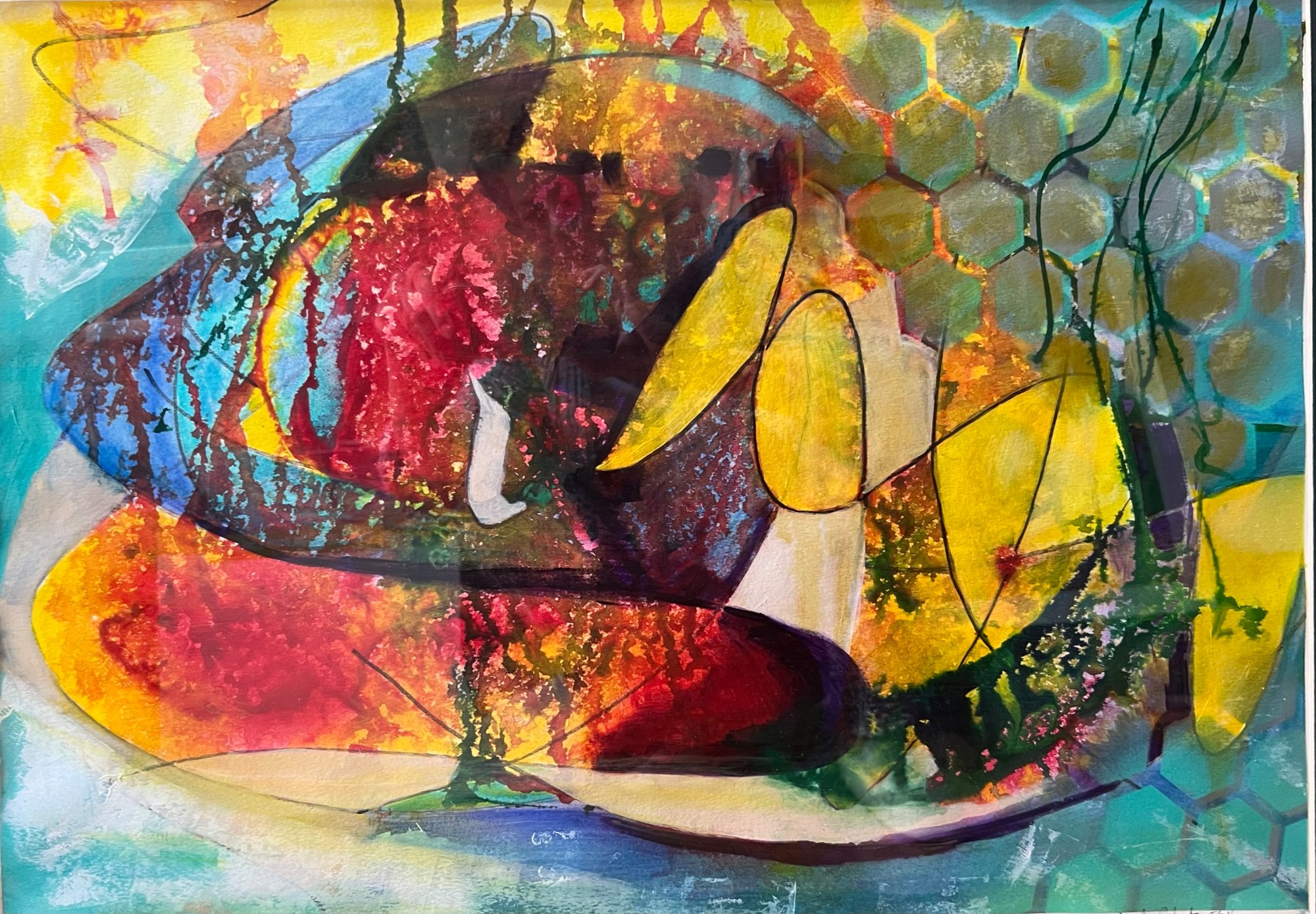 Dive into a vibrant world with "Aruba," an abstract artwork that celebrates bold colors and geometric forms. This piece skillfully intertwines dynamic shades of yellow, red, and blue, creating a visual dialogue that invites exploration. The layered composition and intricate interplay of shapes bring a distinct energy, while maintaining a refined balance.