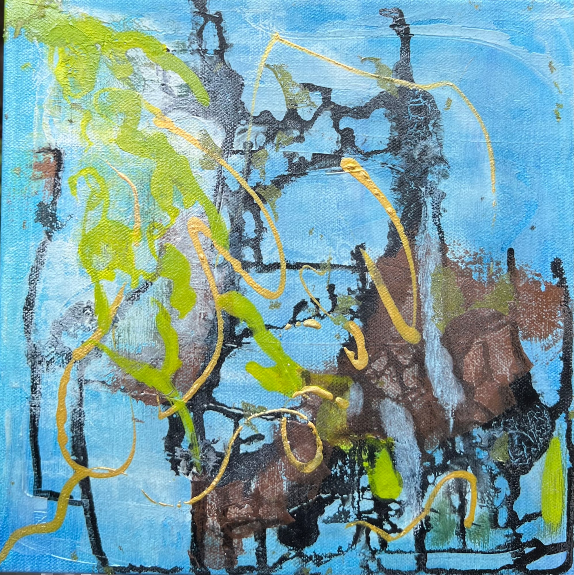 The background is predominantly blue, with various shades creating a sense of depth and texture. Overlaying this, there are bold, energetic strokes of green and yellow, which swirl and intertwine with patches of brown and black. These elements create a dynamic and lively composition, conveying a sense of movement and spontaneity.
