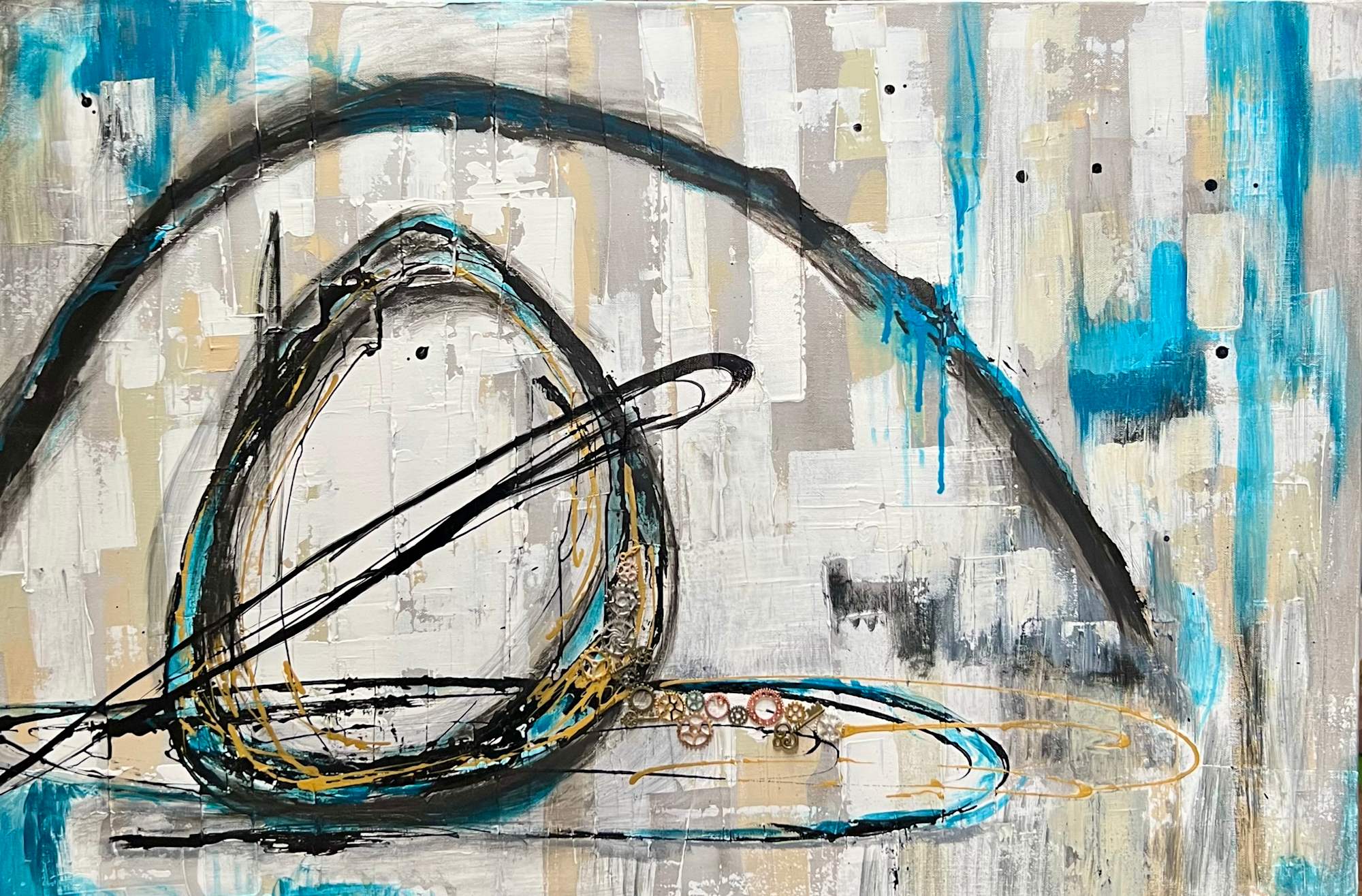 Neutral colors with striking textures and a splash of manganese blue make this piece quite dynamic. The movement of the lines contrasts with the neutral colors and the gears at a texture that tell a story. This piece encourages conversation, it encourages people to step closer and take a deeper look. While simple in its composition, This piece conveys the beauty of modern art.