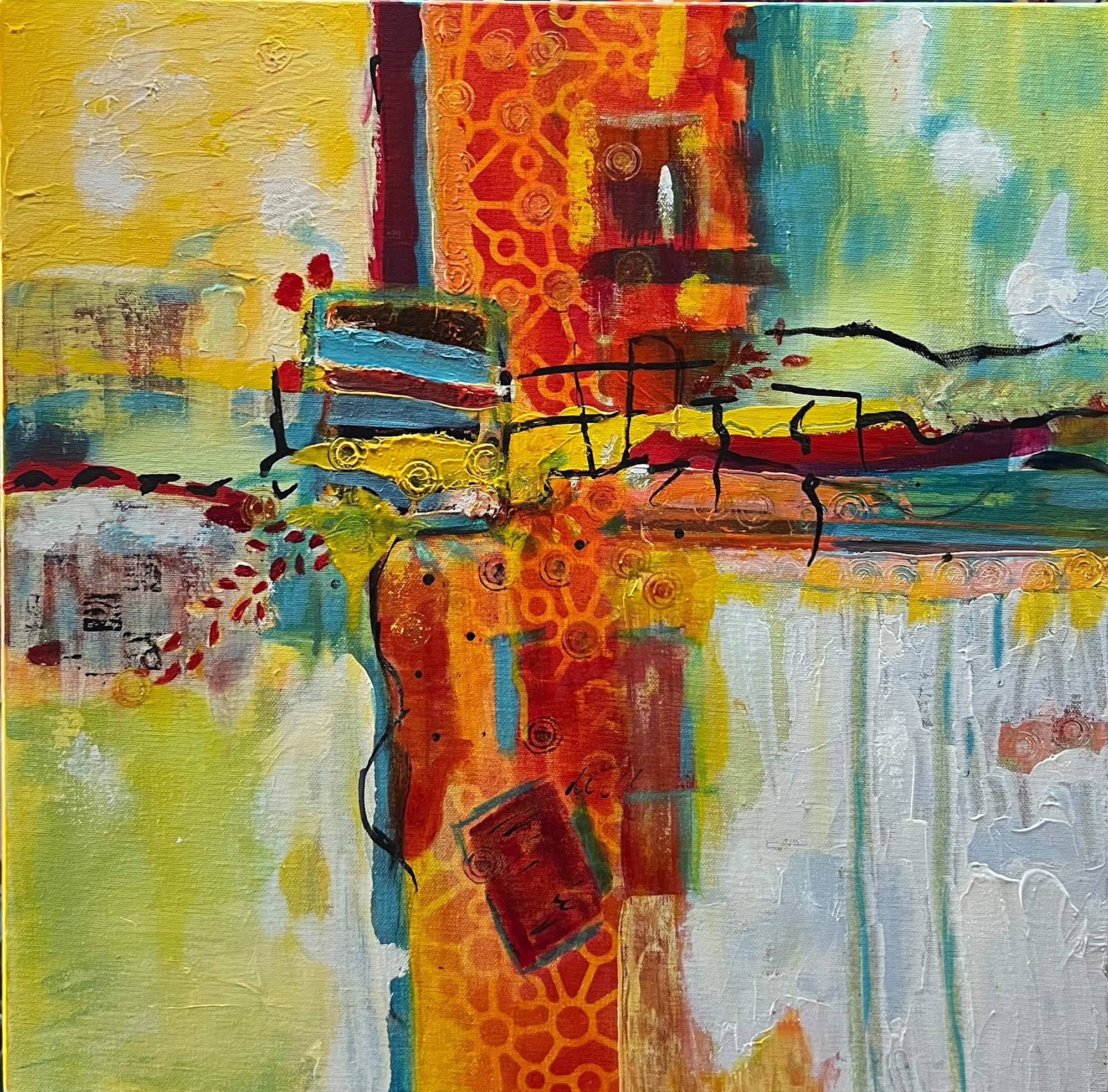 The original of this piece measures 20" x 20" x 1.5" It is painted with mixed media: Acrylics, Inks, Spray Paint, Collage and finished in Oils. Signed and dated on the back. Includes COA
