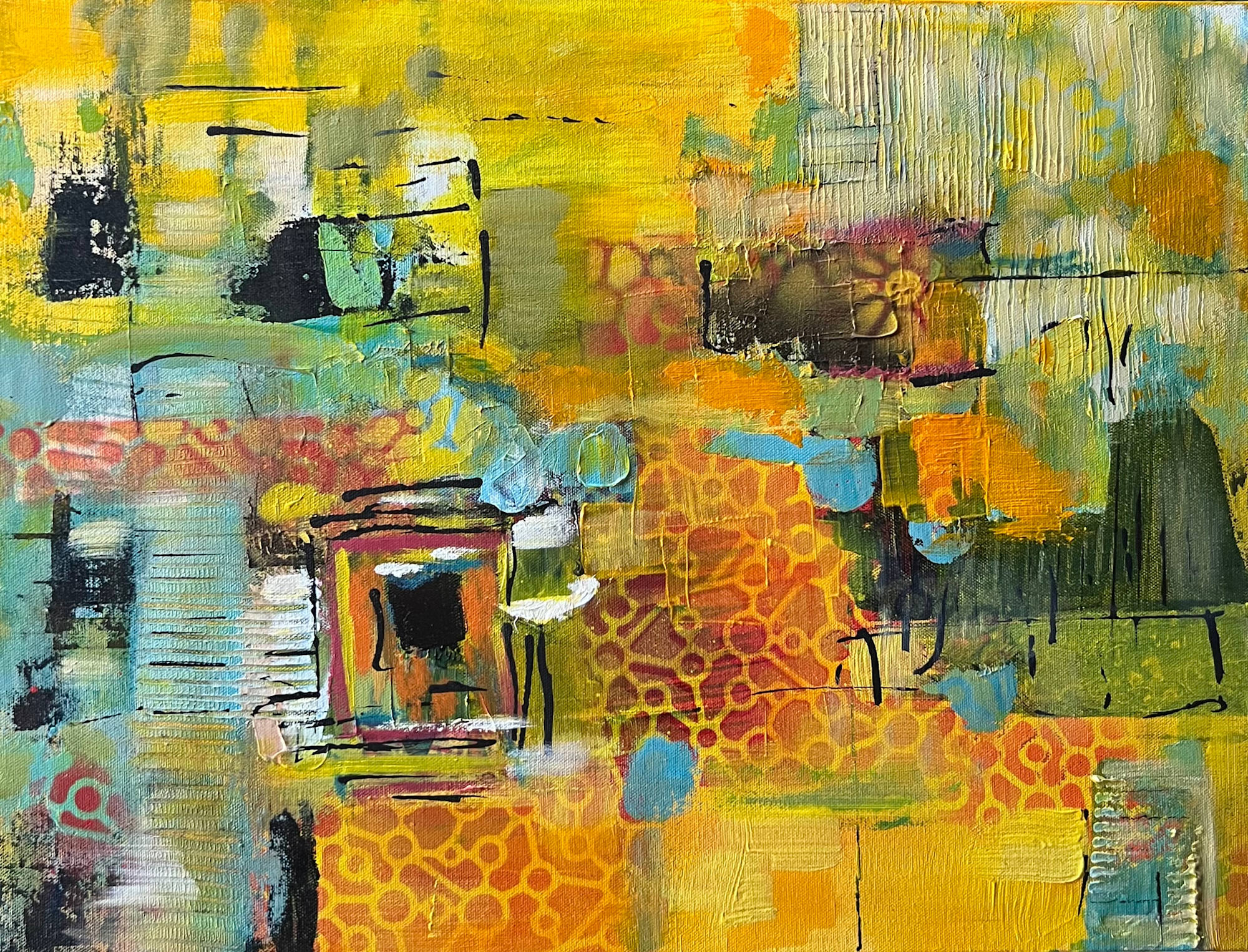 Step into a realm of striking contrasts and intriguing patterns with "Modern Mosaic." This artwork presents a vibrant interplay of colors and geometric shapes, inviting the viewer to explore layers of visual interest. The bold yellows and rich blues come together in a symphony of form and function, creating a captivating focal point for any space.