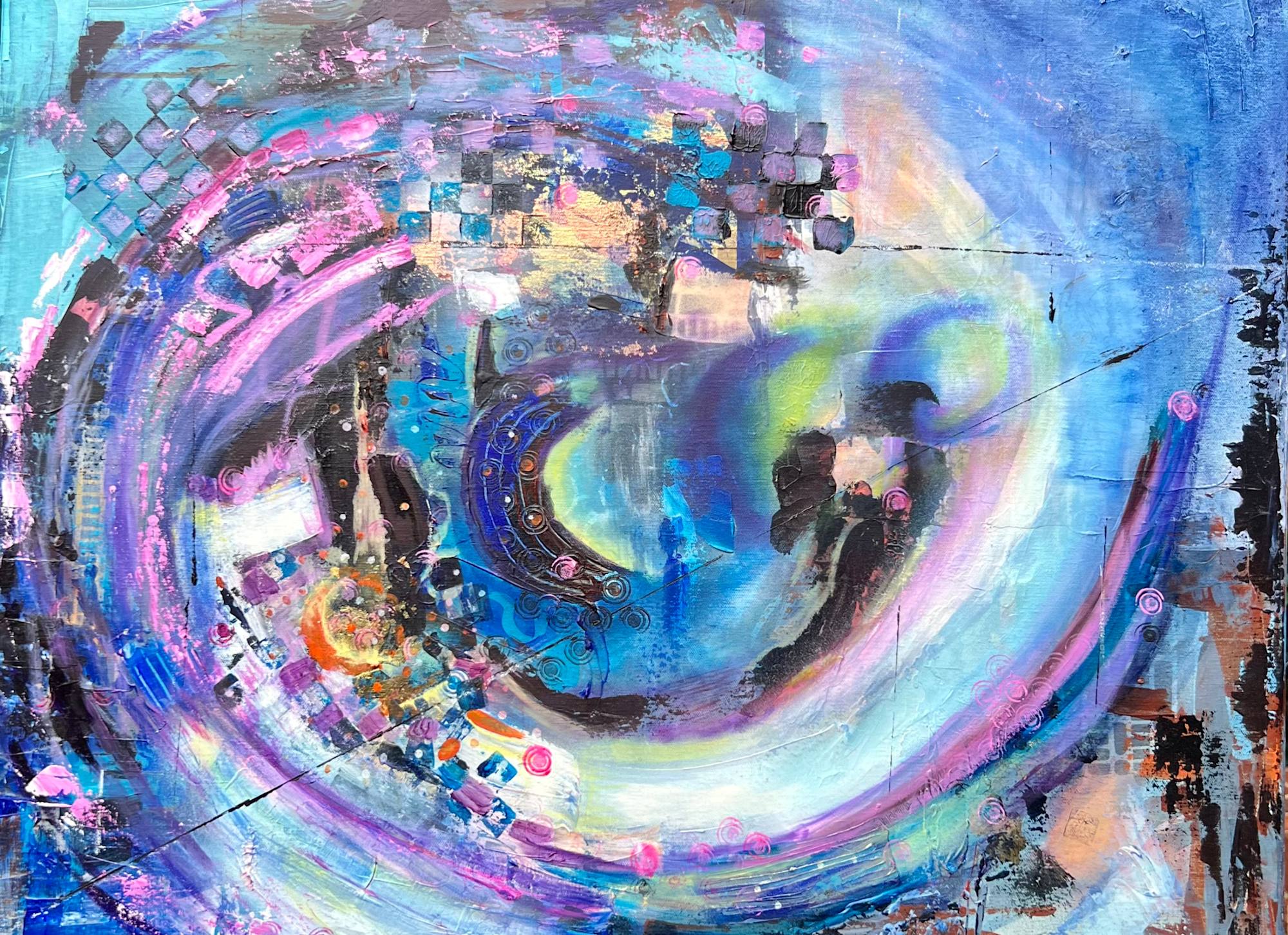 Introducing "Vortex," a captivating new piece that captures the essence of dynamic energy through a masterful blend of mixed media. Measuring 30 x 24 inches, this artwork invites the viewer to experience an enthralling visual journey. At its core, "Vortex" is a mesmerizing depiction of swirling energy, evoking the unending cycle of motion and transformation.