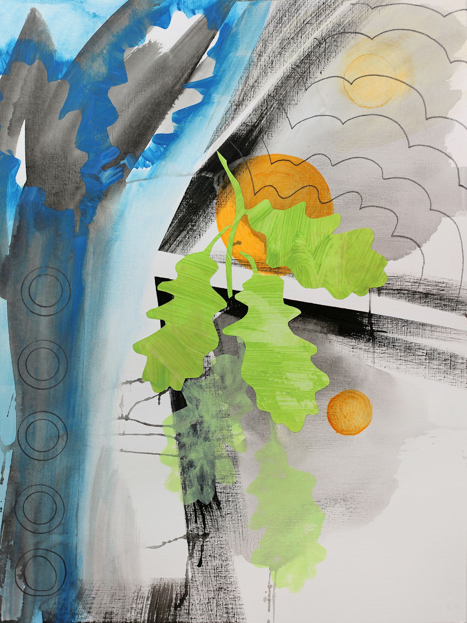 - Subject Matter: Nature, tree, abstract, green, blue, orange, black and white, collage