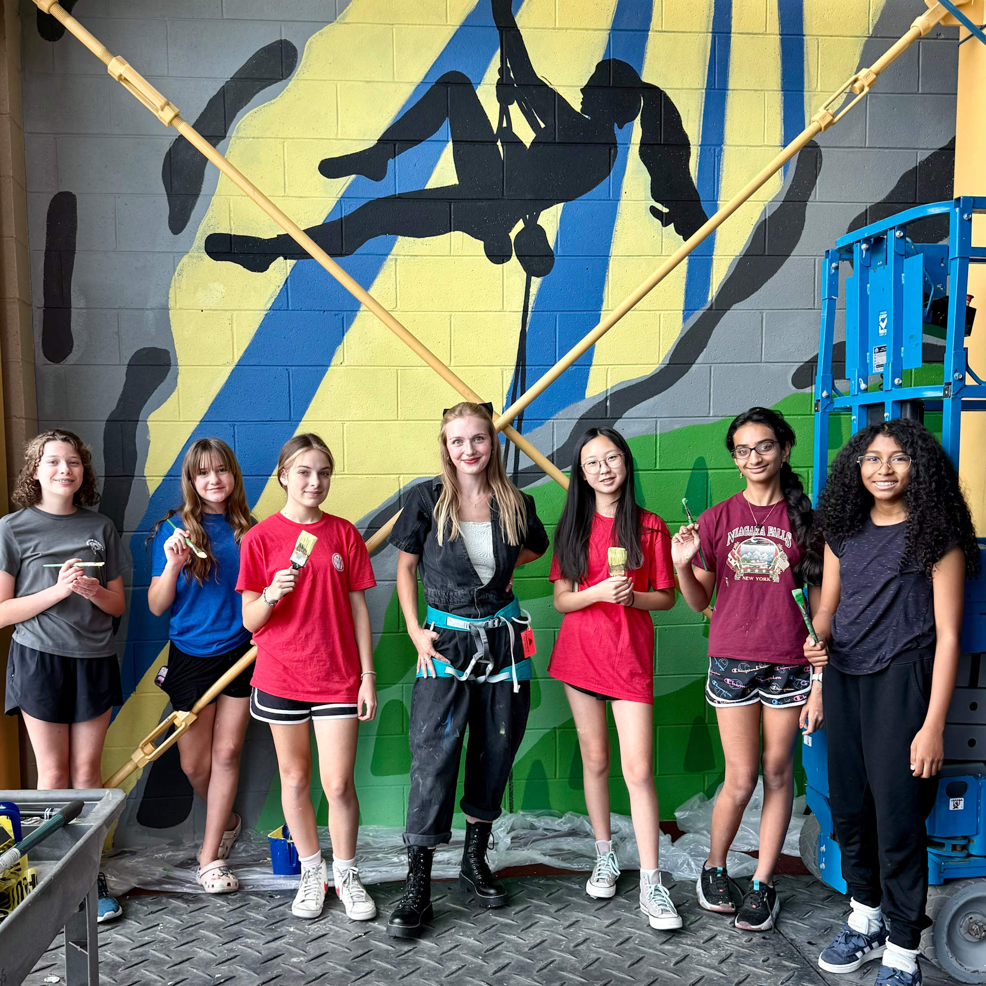 When our friends at the Fieldhouse approached us about creating a mural near the facility’s climbing wall, our answer was an enthusiastic “yes!” From there, the Public Art Commission got to work finding local talent—and soon extended an invitation to American Academy Middle School Art Instructor, Chase Trout, along with seven of her gifted middle school students: Nethra, Avi, London, Addie, Mia, Millie, and Lyla.