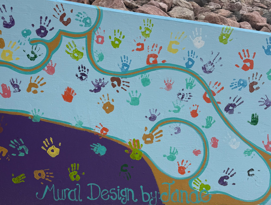 Spanning an impressive 233 feet, this mural was designed by artist Janae Coy (pictured left of Cultural Director Carrie Glassburn), who incorporated themes of nature to represent the visual expression of neighborly love. After Coy outlined the design and color coded them by number, the mural came to life with the help of more than 175 women and girls from 13 congregations from The Church of Jesus Christ of Latter-Day Saints.