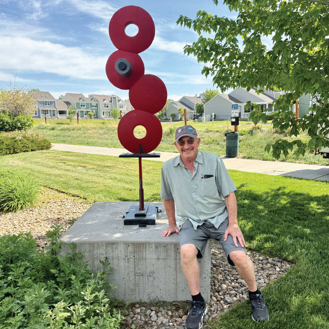 Andy shares that most of his inspiration comes from the urban environment, as he’s always lived near or in urban areas. “Whether it be my metal sculpture or other media, I have always tried to push my images forward.” Visitors will see that “Disco Deco” embraces that urban aesthetic. It’s a bright and colorful sculpture that incorporates four farm disks borrowed from another piece he created in 1973. Taking inspiration from deco design, Andy says the final sculpture suggests a small deco table.