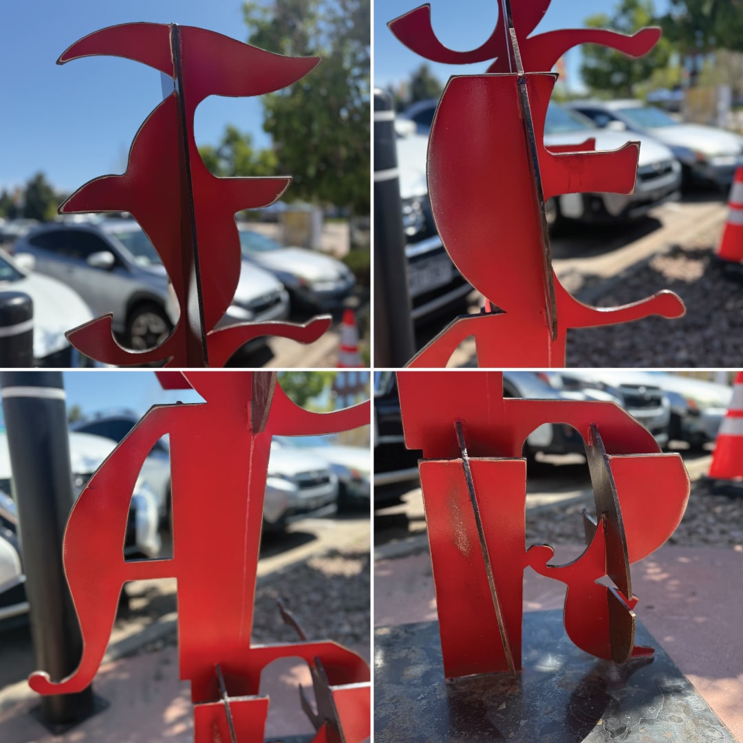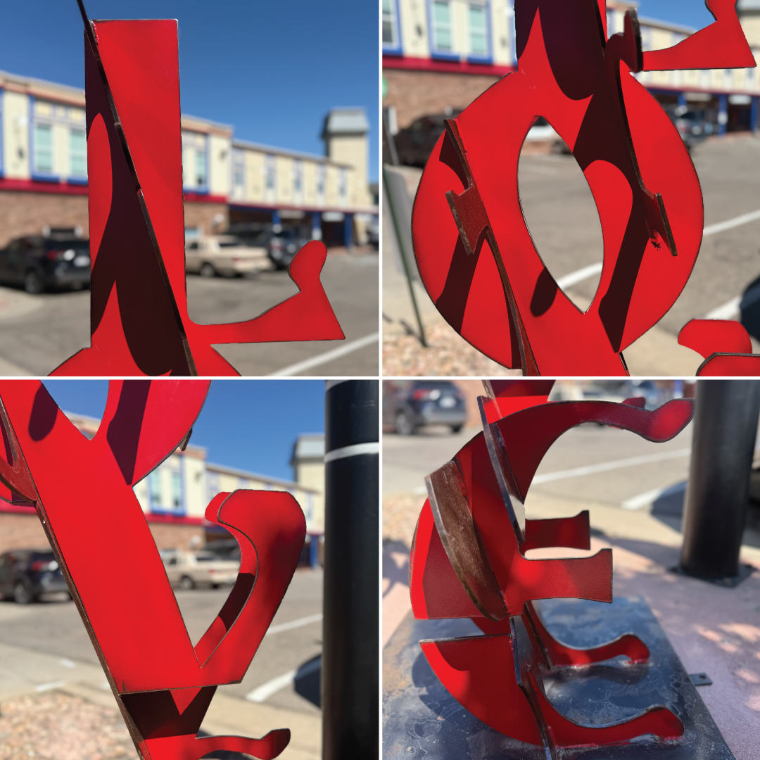 Joe shares that his work focuses on the dichotomy of organic and human-made shapes existing together. “I find it reassuring that mathematic geometry and organic shapes can exist together, like a perfectly smooth road winding through the jagged mountains.” He adds that recently, he’s been drawn to sculpting large words and embraces that concepts of opposites can exist together in the same person or society. “Someone can have LOVE and FEAR at the same time, and I find that a very useful conversation.”