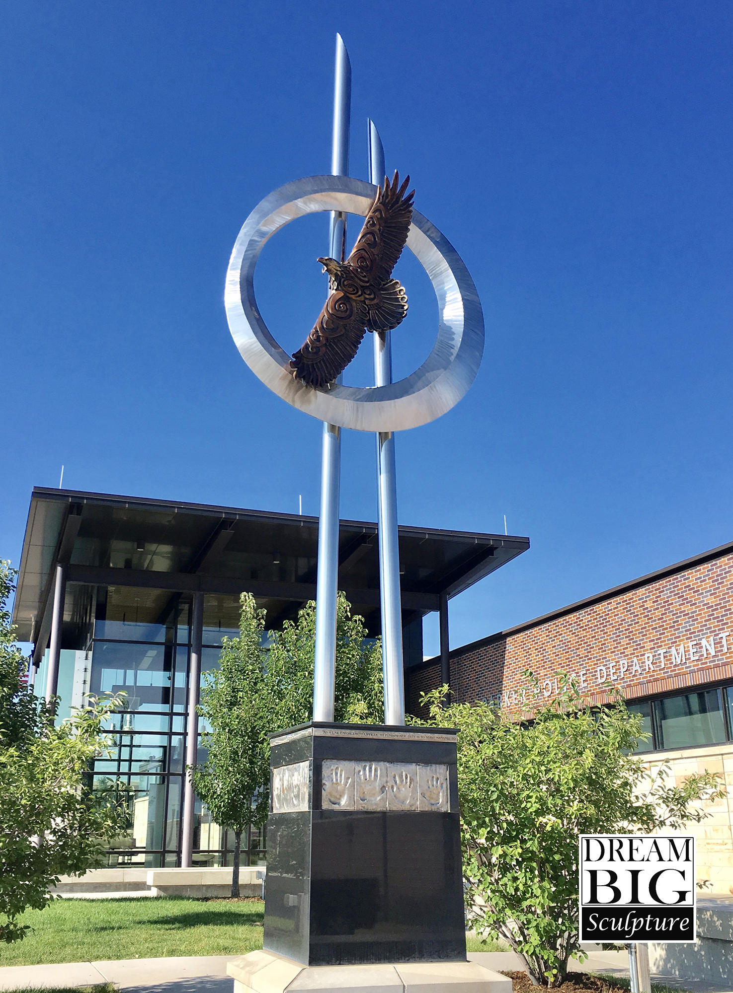 In June 2010, artist Adam Schultz was commissioned to produce an innovative public art sculpture for the Town of Parker’s new Police Department. Schultz’s creation, “Freedom Through Safety,” features a life-sized bronze eagle in flight, held 14 feet in the air by two vertical stainless steel pillars. One pillar represents safety, and the other symbolizes strength. The base of the sculpture includes a “circle of hands” — tiles pressed with handprints of local community members from children to senior citizens, metaphorically representing the support and involvement of the community.