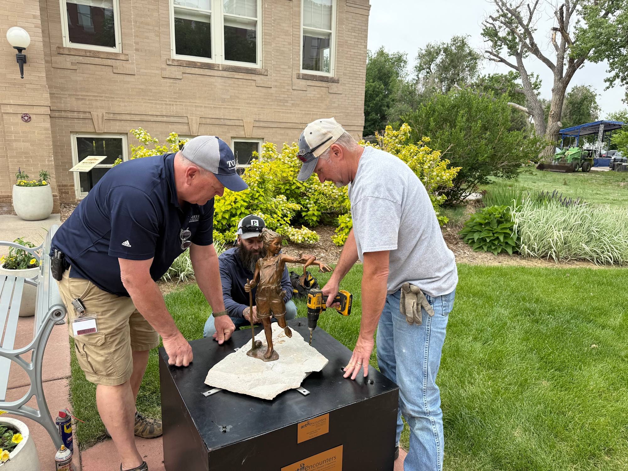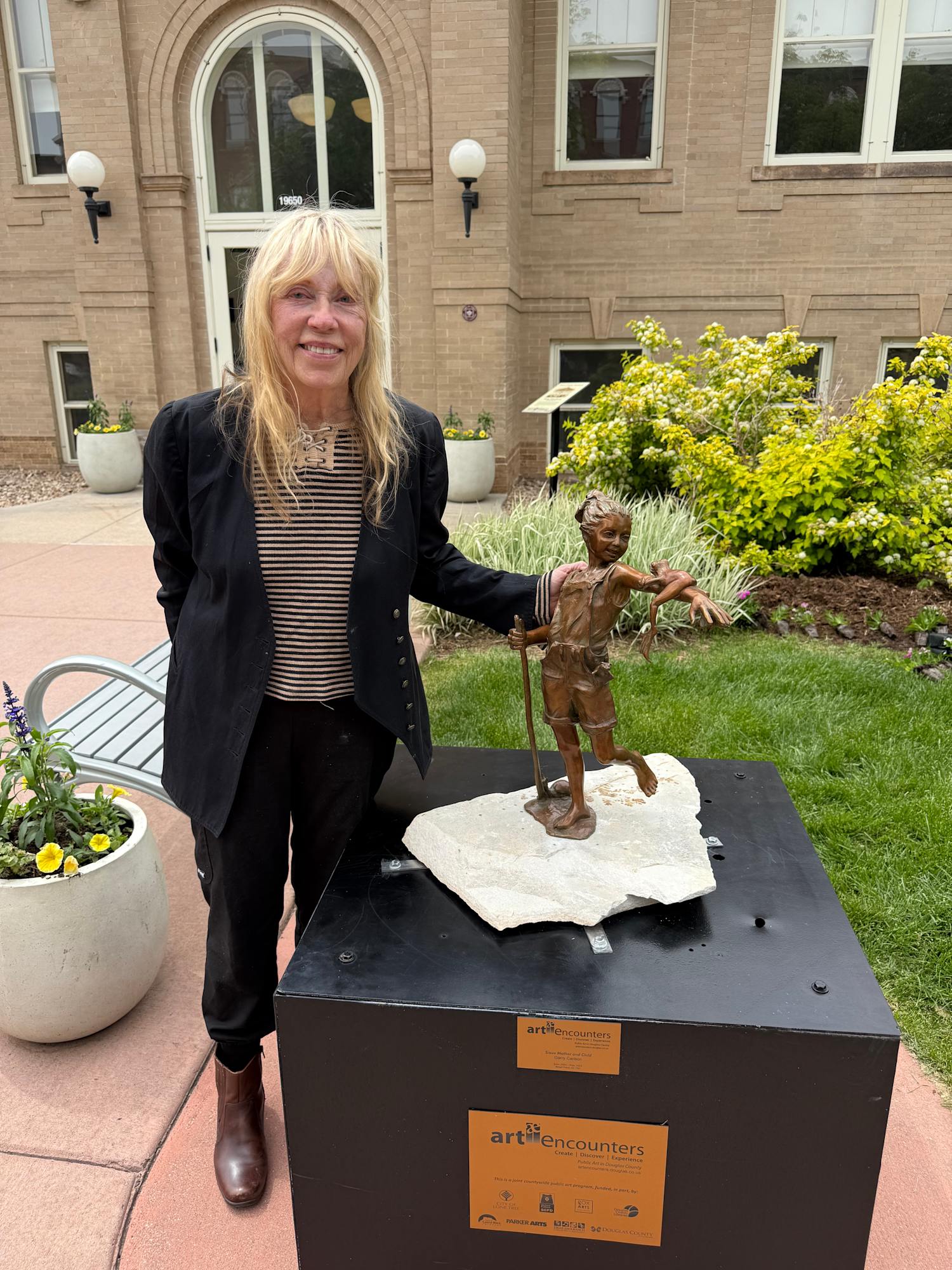 The endearing “Froggy Summer Days” sits outside The Schoolhouse. Bobbie shares that this darling piece was created as part of a 24-hour sculpture competition in Green River, Wyoming, where artists were asked to incorporate water as a theme. She said a cute girl stopped by during the competition and agreed to be her model. “It was a fun, if tiring, weekend.”