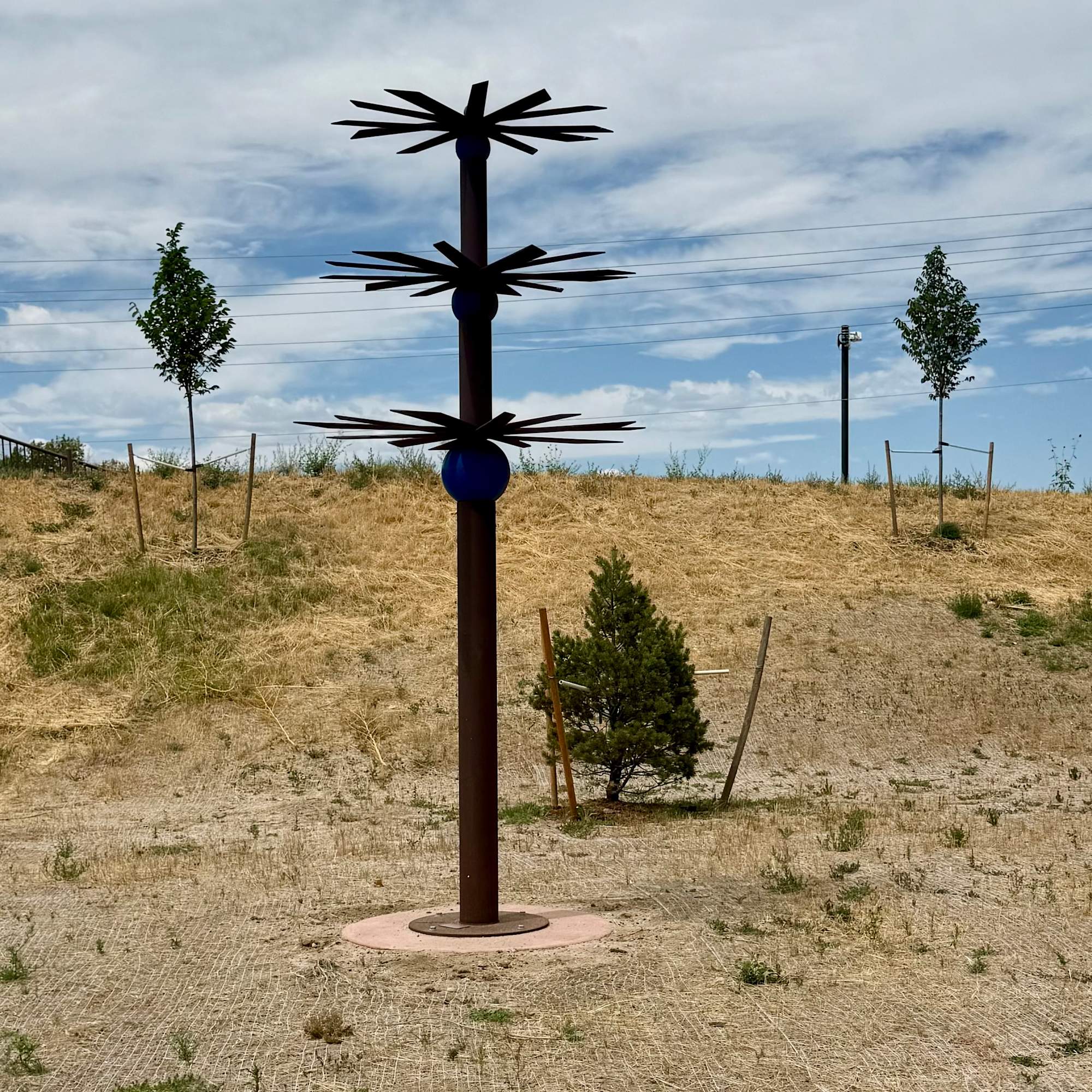 On display at the PACE Center lot, “I’m Dreaming With My Brain Awake” is a steel and powder coated sculpture by artist Sandy Friedman, whose work is influenced significantly by the environments of Colorado and the Southwest. In this sculpture, the colored spheres are depicting Father Sky, and the slightly patinated horizontals, along with the columns, represent Mother Earth. The horizontals also indicate the vastness of the land as seen in all directions, and the columns are the strength of the Earth and represent the mountains.