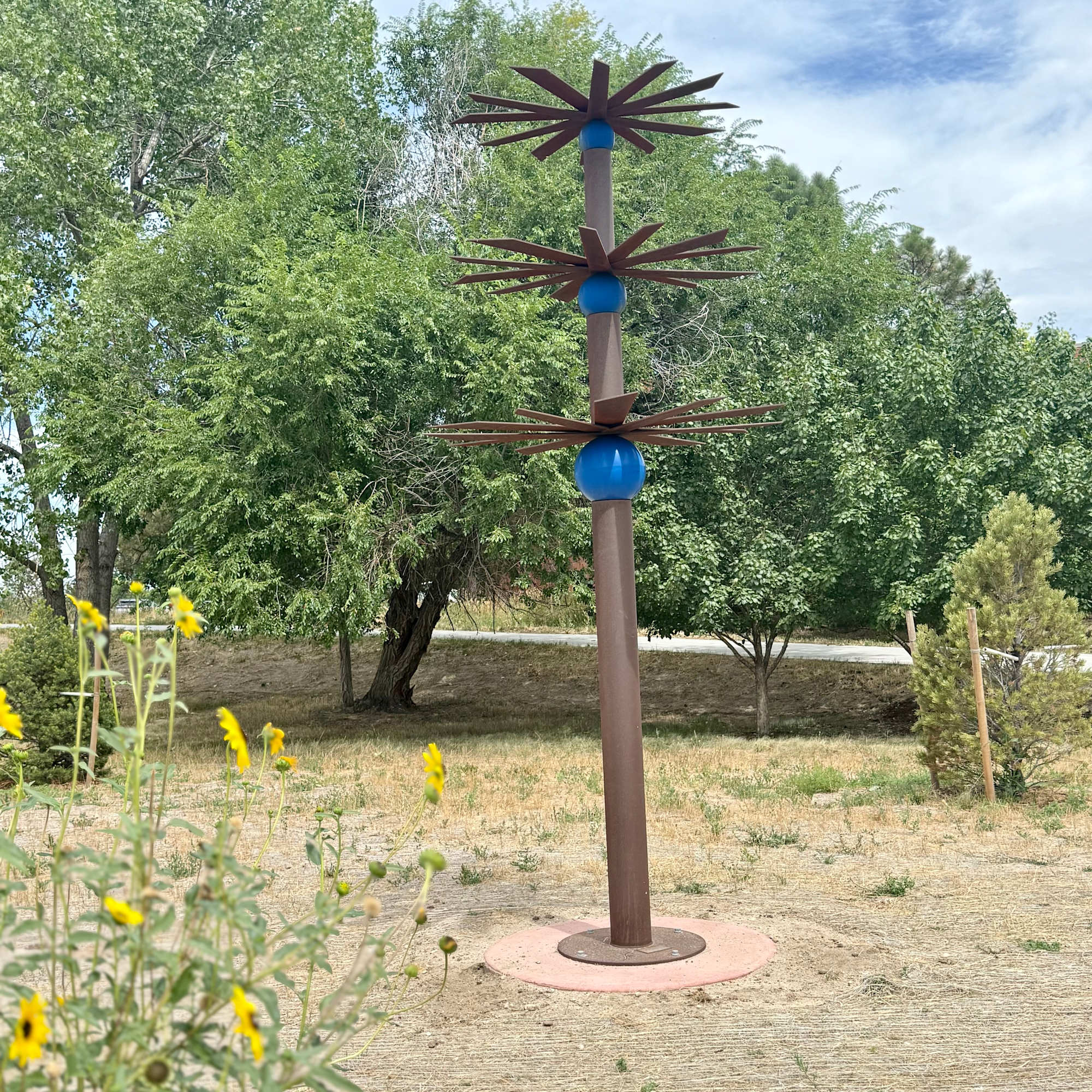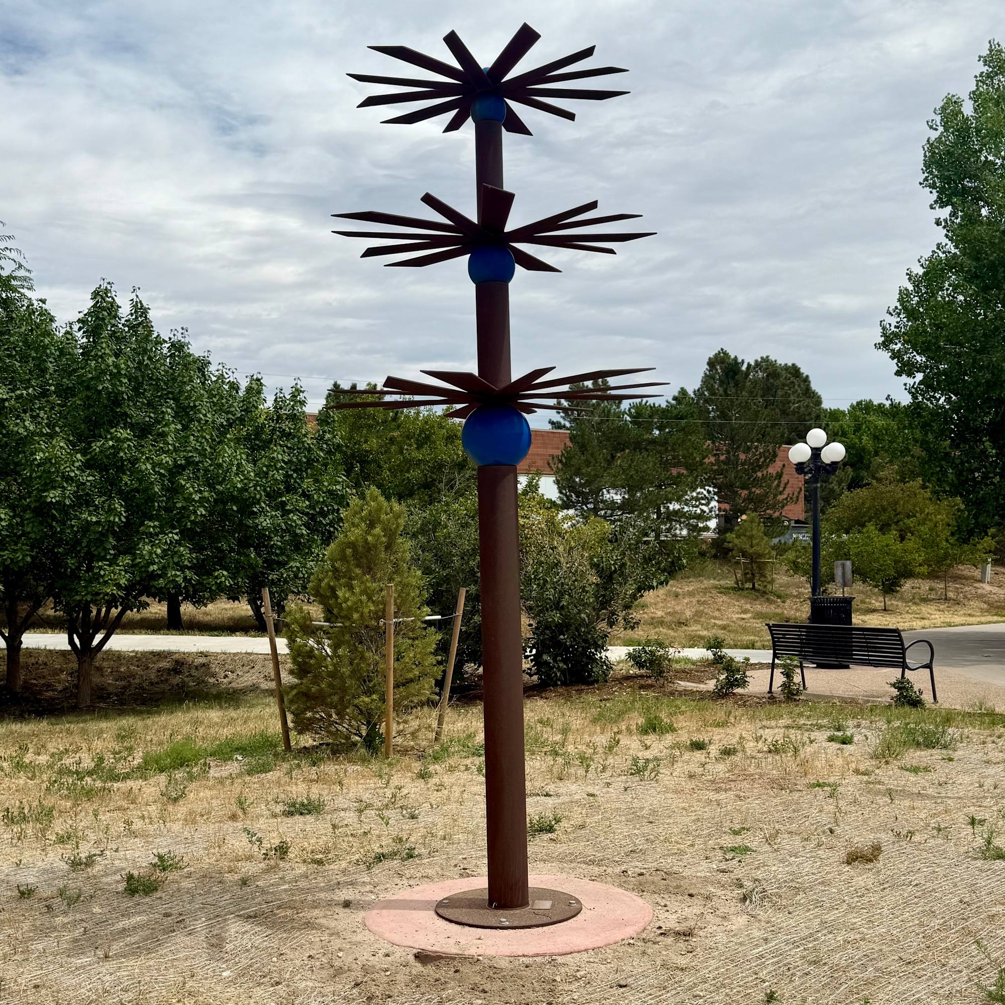 In this sculpture, the colored spheres are depicting Father Sky, and the slightly patinated horizontals, along with the columns, represent Mother Earth. The horizontals also indicate the vastness of the land as seen in all directions, and the columns are the strength of the Earth and represent the mountains.