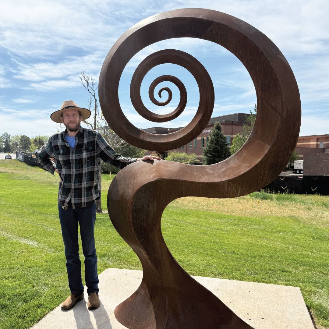 Passersby will be enamored with this whimsical corten-steel piece, which sits at the corner of Mainstreet and Pine Curve. Diego shares that he draws ideas from the plant and animal kingdom. "There are aspects of it that are reminiscent of a serpent, as well as a new vine that is springing up out of the ground. The main portion of the sculpture is a large spiral, which also has many different meanings. It is also open to interpretation, so feel free to find your own take on it."