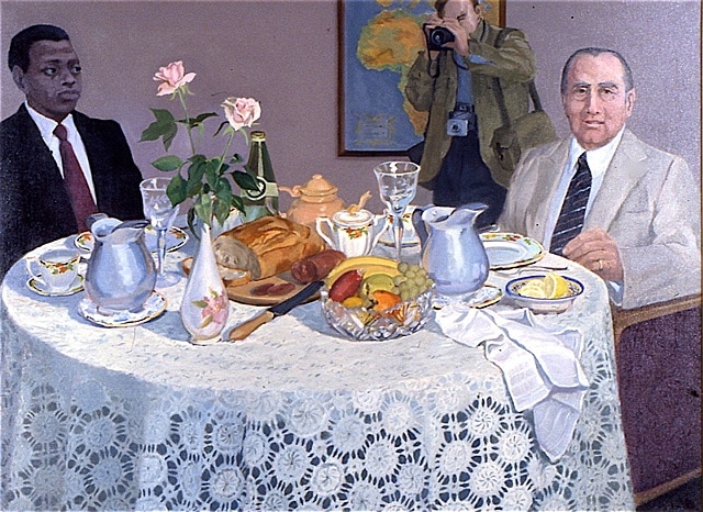 This is my version of Manet's "Luncheon in the Studio" and those other Impressionist paintings where people seem to provide the excuse for painting arrays of food and tableware. The subject here is a breakfast meeting between the president of Burundi and the president of France. Where Manet put a painting on the wall I added the map of Africa to locate it and raided my kitchen for props.