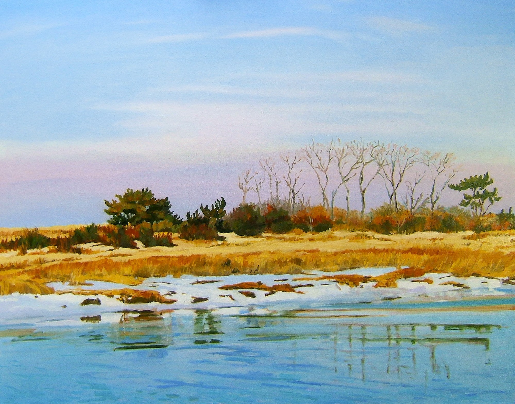 This painting was on exhibit at the Islip Art Museum in the summer of 2009. New York Times critic Benjamin Genocchio wrote, "Pat Ralph's 'Sunken Meadow Dunes:Winter' is among the best of the paintings on view. I liked it as much for the obvious quality of the artist's technique--done with a minimum of gesture--as for the way she layers the paint to give a sense of snow covering part of the ground. Ralph draws beauty from a seemingly banal subject."