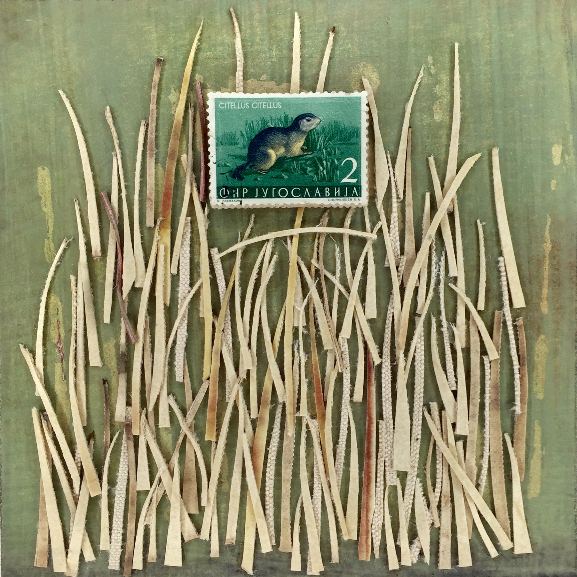 One stamp depicting a ground squirrel is nestled in cut paper that looks like reeds against a painted background
