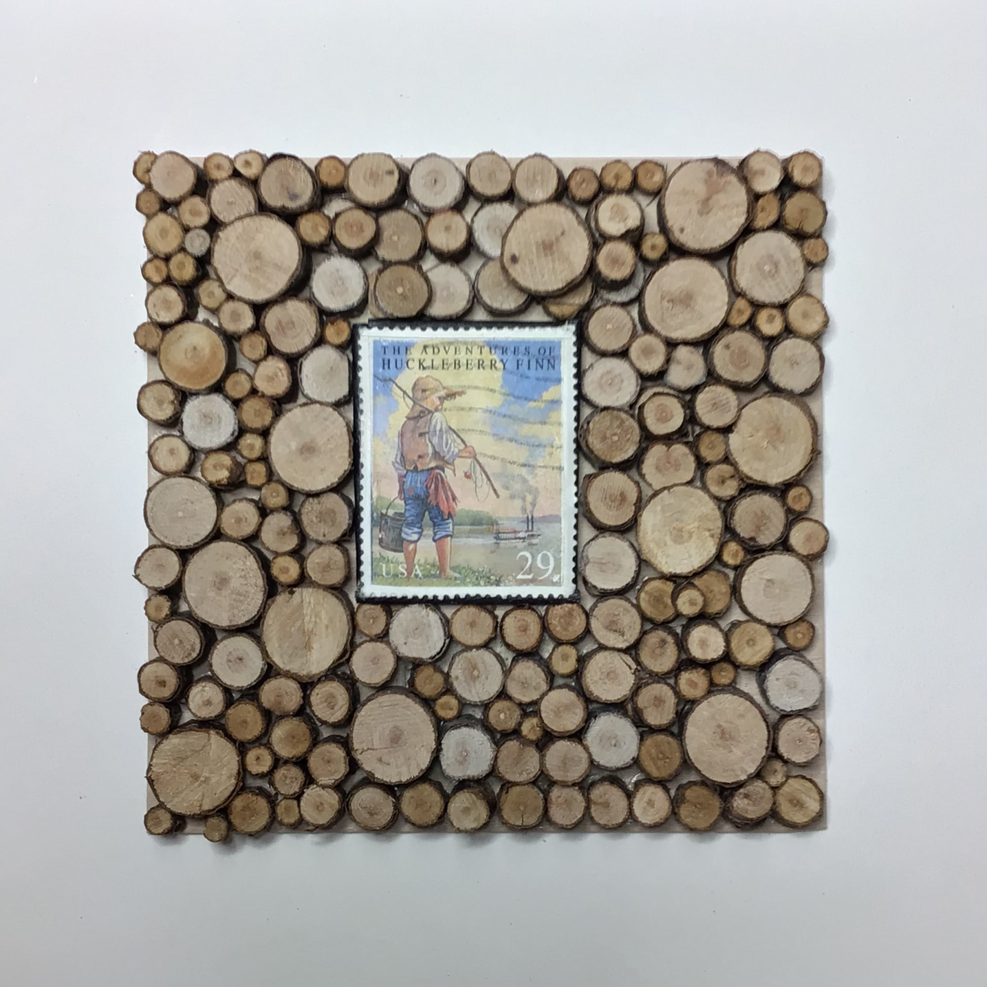 Circular wooden bits, sawn from branches, lay in square cluster around USA 29 cent stamp of The Adventures of Huckleberry Finn