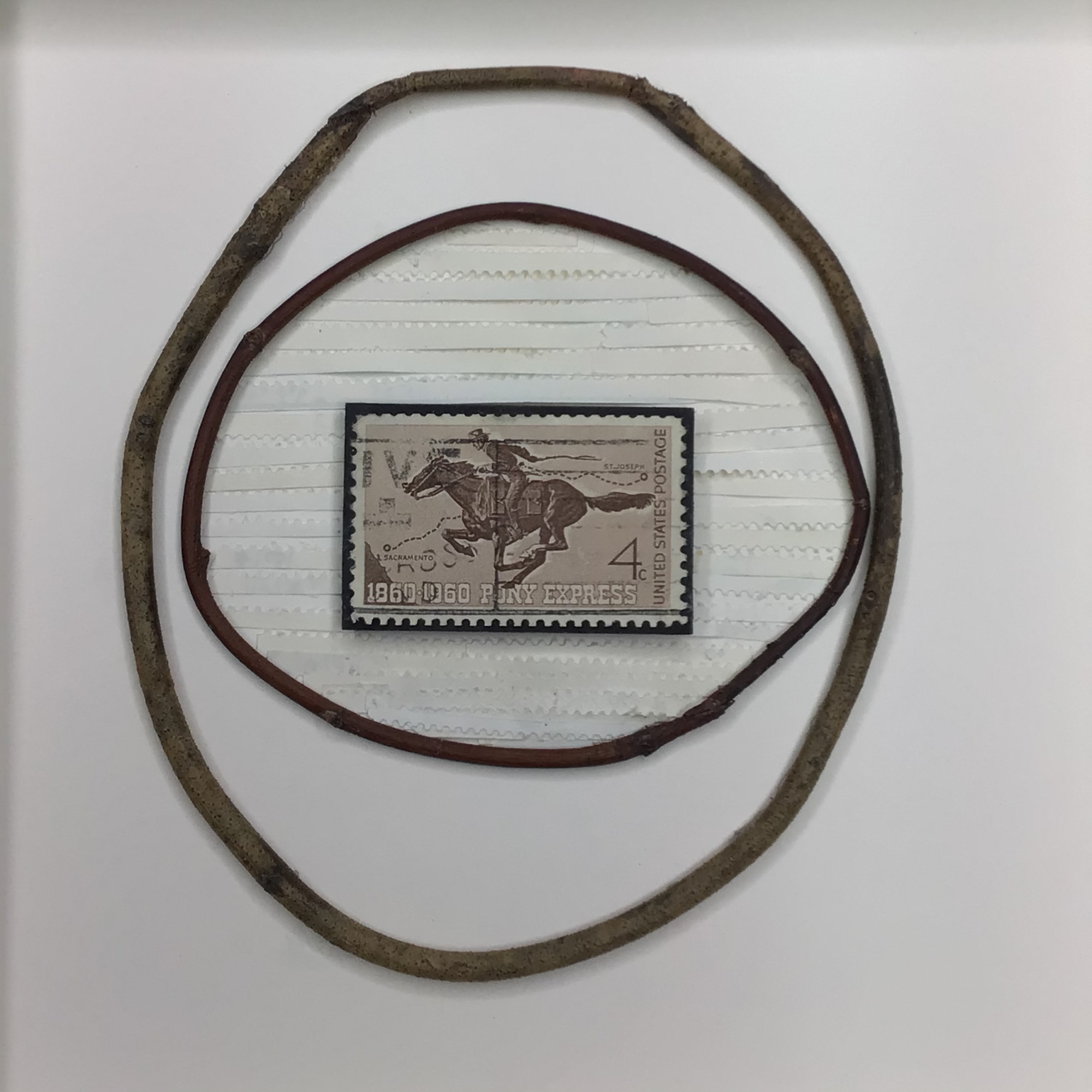 Two delicate plant roots curve in concentric circles around the United Sates Postage 4 cent stamp honoring 1860-1960 anniversary of the Pony Express. Behind the stamp, inside the circles, are crenellated edges of stamps.
