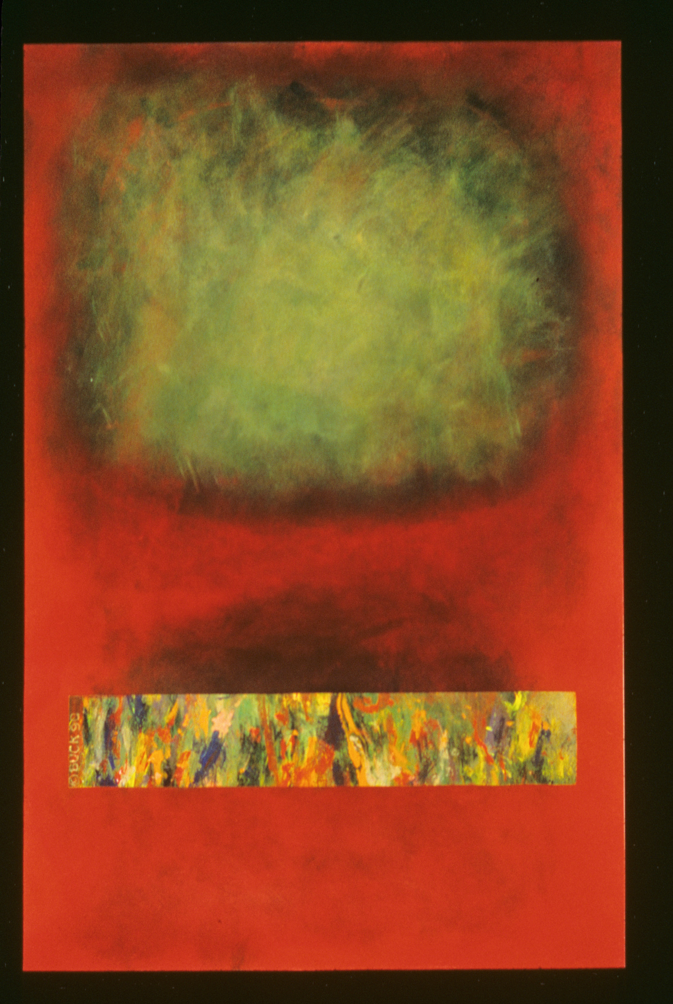 MessageRed ground, gold cloud on top half of diptych, multi-color collaged bar/glyph.