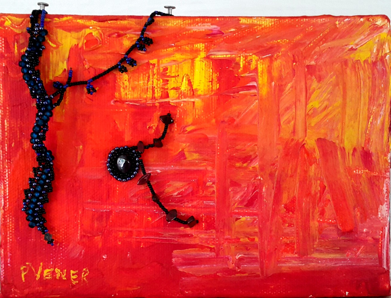 I first got the idea for "Firestorm" from seeing some photos of the big fires in the western United States. I had some leftover still wet paint from another, larger painting I was working on and so decided the time was right to start this one as well. I recalled seeing the silhouettes of trees embedded in the flames and added the dark bead weaving as a reflection of their presence in some of the more striking photos.