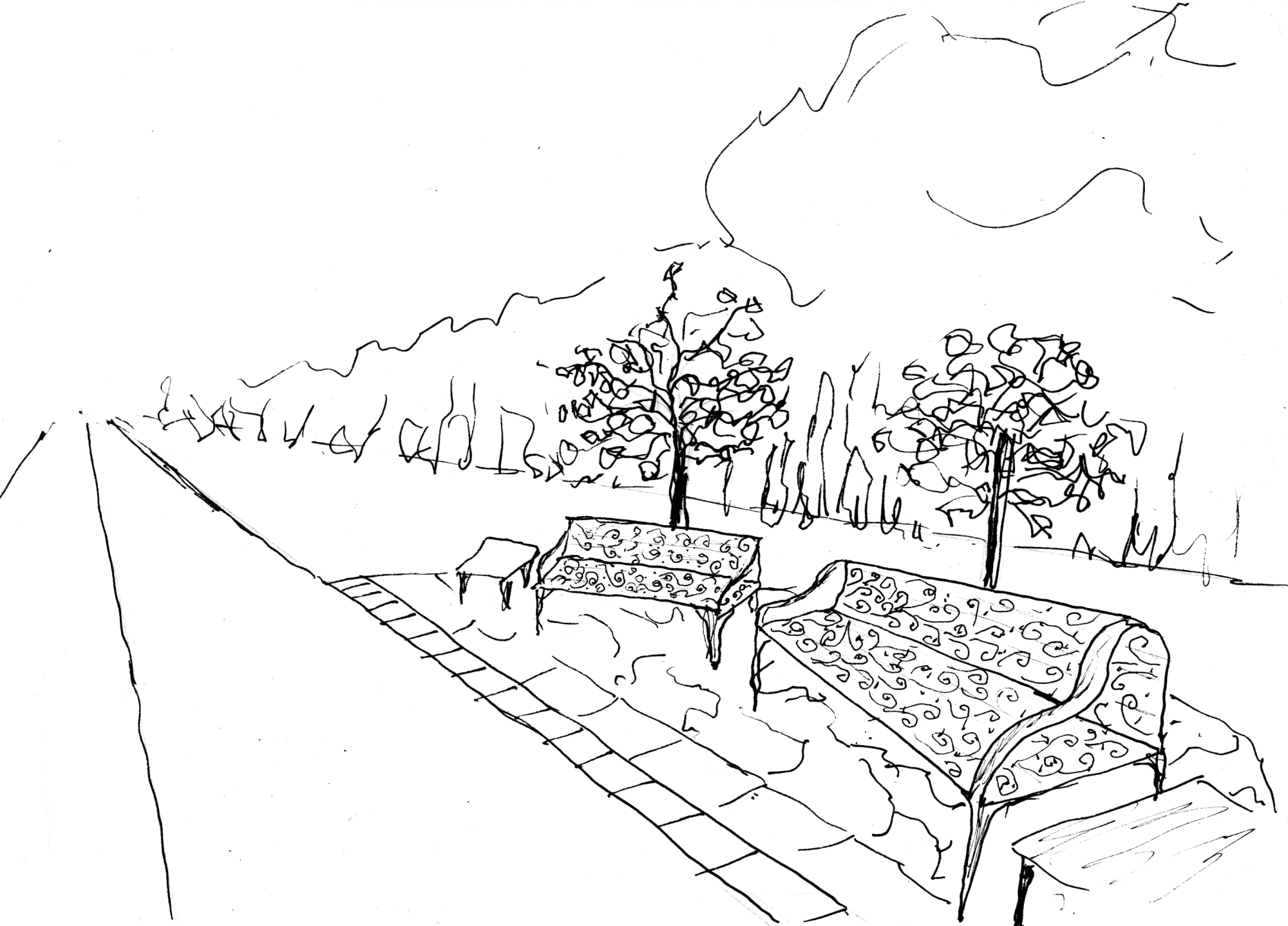 The concept is a living room outdoors for a bit of artistic respite. The benches and end table are to be painted in my abstract style. Two fruit trees play the roll of floor lamps. KInetic recycled art will form "wall" decor in among the trees.
