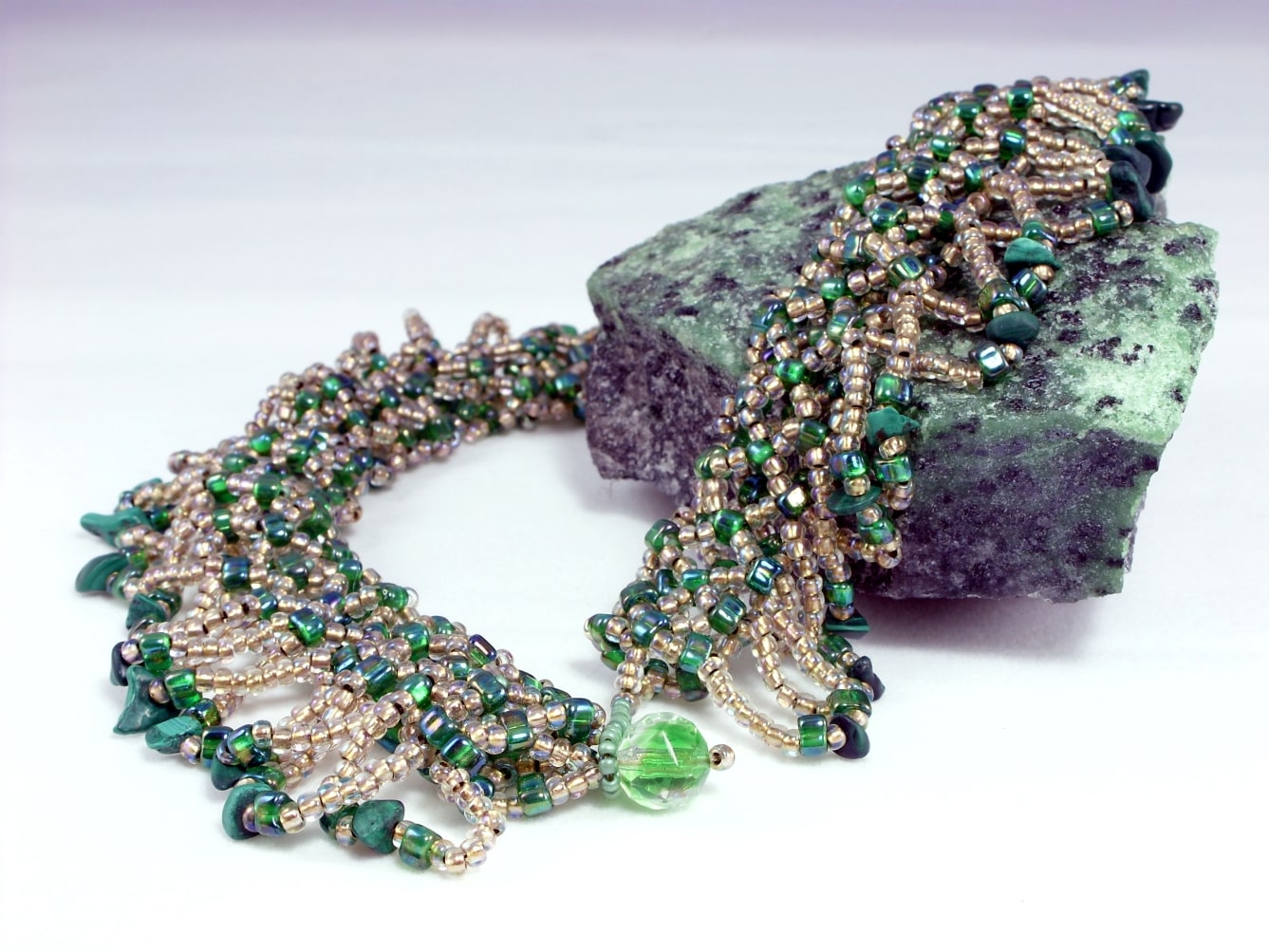 This is a spiraling weave of interlocked beads called tubular netting. The overlapping fringe includes real malachite chips. The clear beads are lined with shimmery brass. It has a bead and loop clasp so there is no metal touching your skin.
