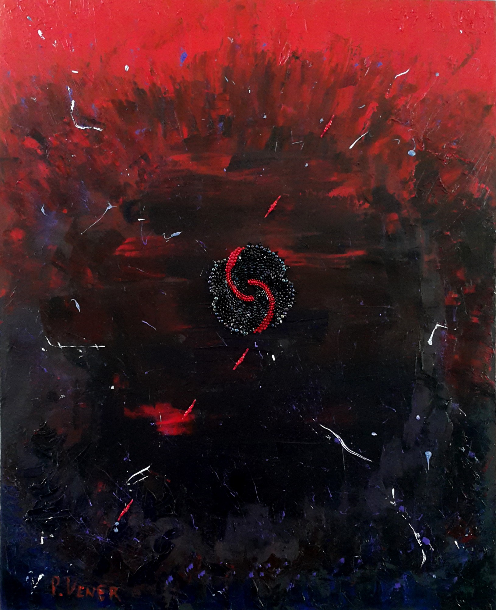 Both the oils and the acrylics are thick paints and when properly laid can give me a lot of texture. This painting, though, begain with a thinner layer of acrylic paints; red at the top blending into black on the bottom. This was then covered by a thick texture of acrylic that would thin out the closer to the center we got. On top of that, I did the same thing with the even more thick oil paints. This painting took a long time just because of the bead work, but also because oil paints take a long time to dry.