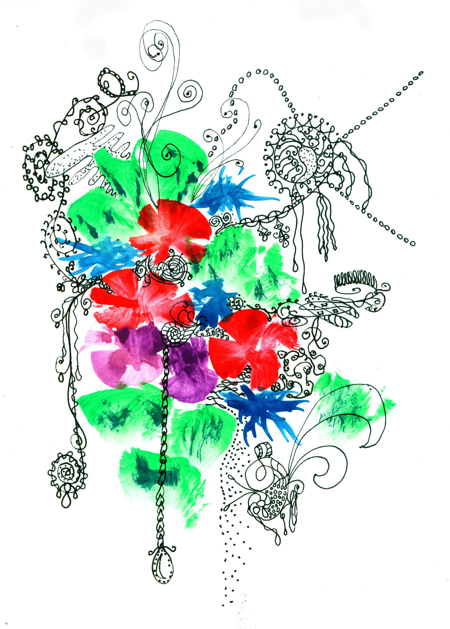 I start with a watercolor base of a bouquet of flowers and then add the hand drawn windings of black pen and ink to bring the work through an intersection of Impression and Abstract perspectives.