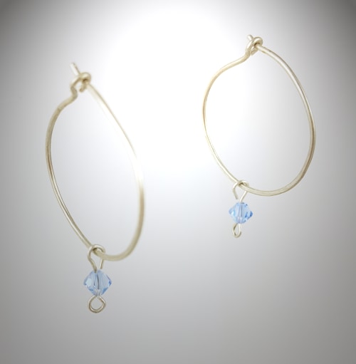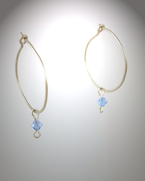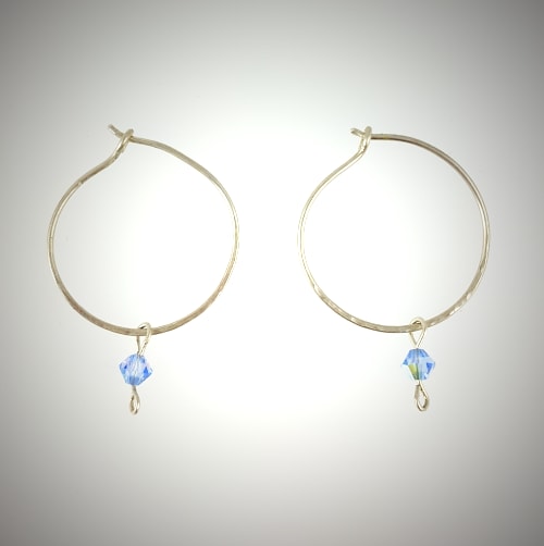 Slightly under an inch in diameter, these hoop earrings are hand formed and hammered on the bottom half for extra shimmer. They feature removable faceted blue crystal bicones (3 mm size) made by Swarovski.