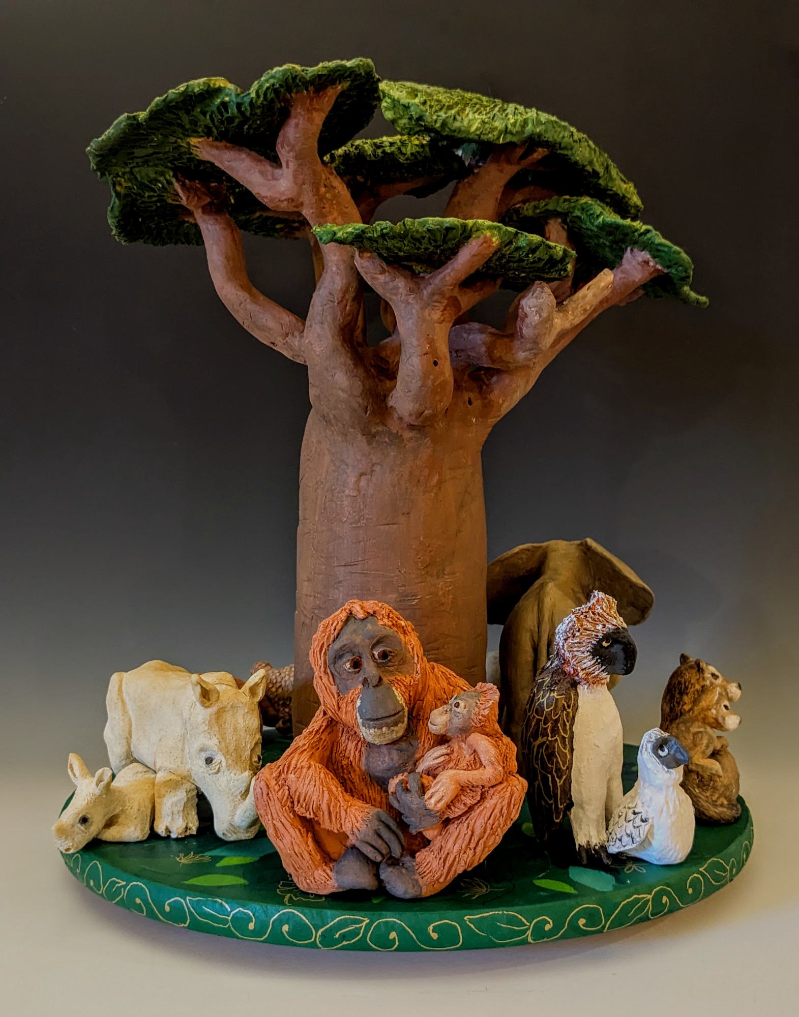 MessageCarousels are symbolic of the cycle of life and of innocence. Mine is populated with clay sculptures of endangered animals: Orangutans, Pangolins, African Penguins, Red Wolves, White Rhinos, African Forest Elephants, and Philippine Eagles with their offspring under Baobab tree, the Tree of Life. It is an illustration of what we stand to gain if we protect our planet - or lose if we do not