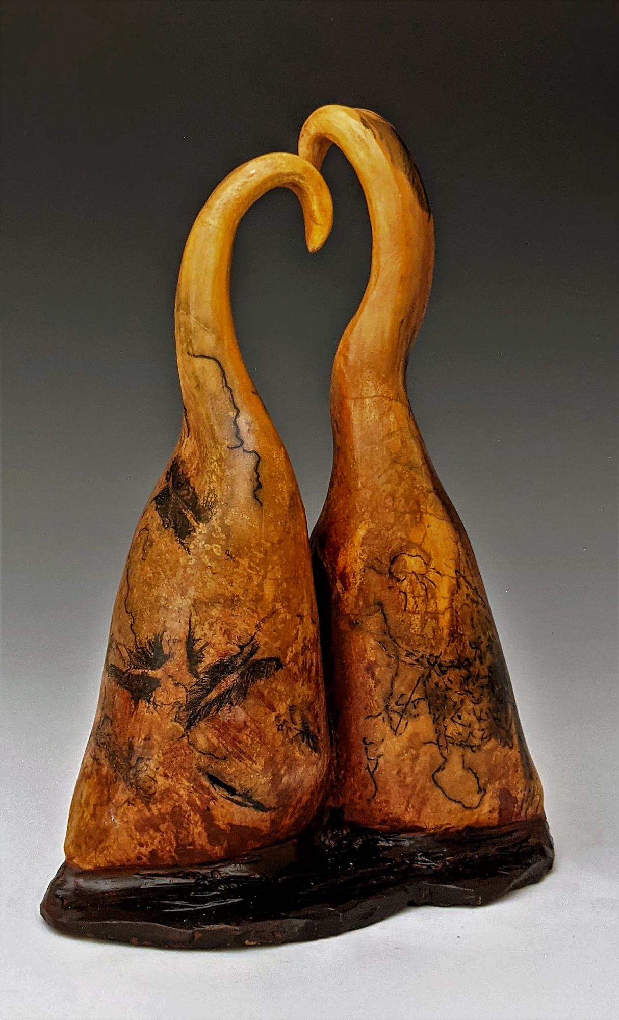 MessageThis abstract of two figures in a loving embrace was hand built from stoneware clay and raku fired where the piece was removed from an 1800 degree kiln, then decorated with horsehair, feathers and ferric chloride giving it its warm palette.