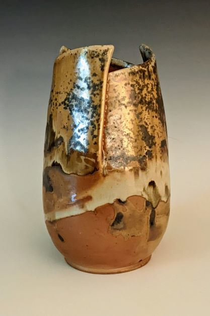 MessageThis vase was thrown on the wheel and then altered. The iridescent glaze was achieved by wood-firing the piece - a 36-hour long process of constantly feeding the kiln with wood to achieve temperatures hot enough to actually melt the ash which then glazes the pieces with the minerals trapped in the wood.