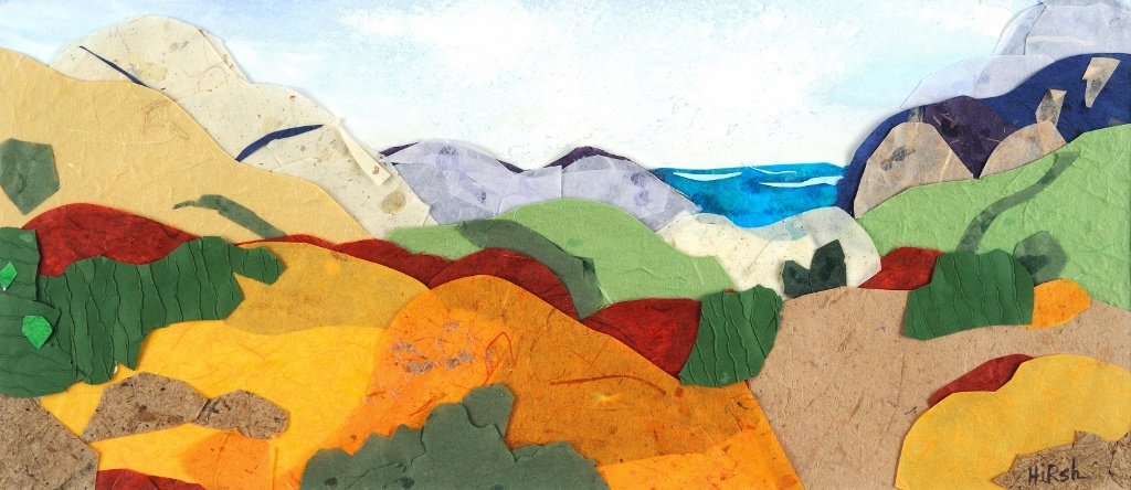 Message"Golden State" is the nickname for my native state, California. This collage piece captures a typical landscape--golden hills sprinkled with live oak trees and a bonus look out toward the Pacific.