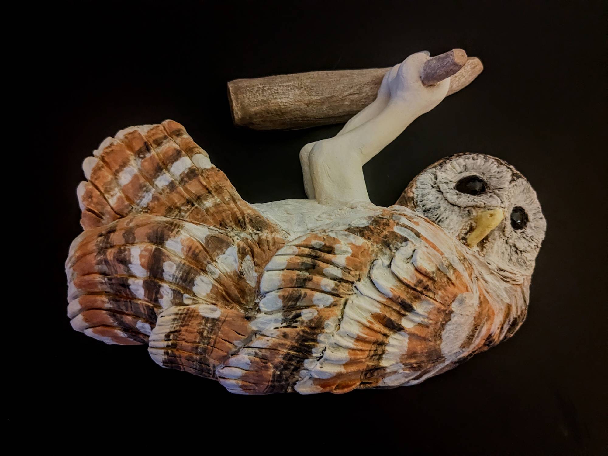 MessageThis wall piece of a Barred Owl hanging from a tree branch was inspired by the antics of an owl I was watching in my backyard.